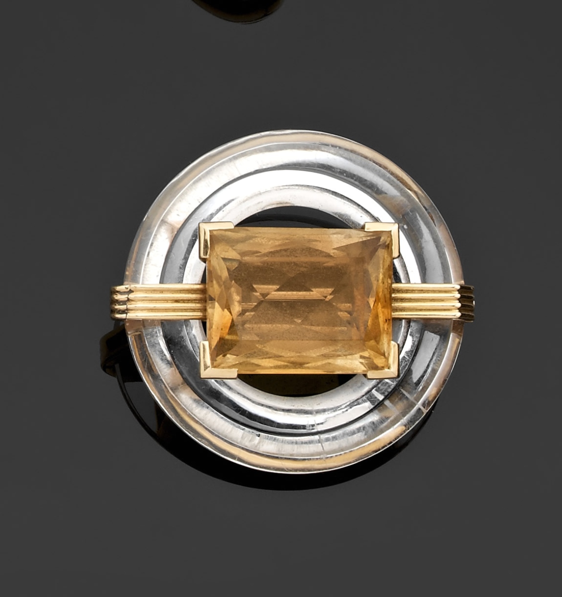 BROCHE en cristal de roche et or, composée d'un élement circulaire ajouré coupé d'une barette à quatre godrons sur laquelle est fixée une citrine rectangulaire à angles vifs, montée en chaton à griffes. Système broche et sécurité à vis.