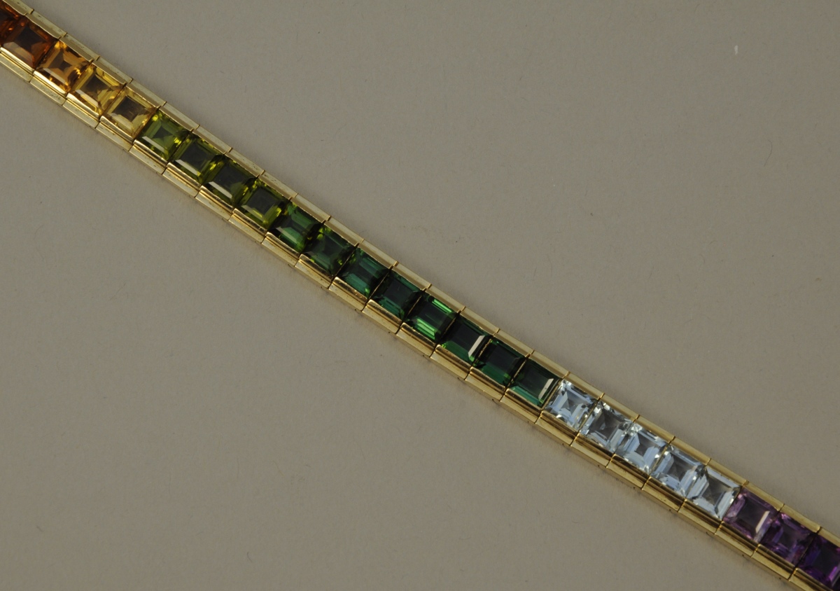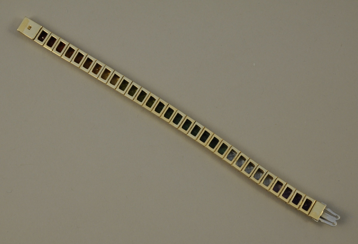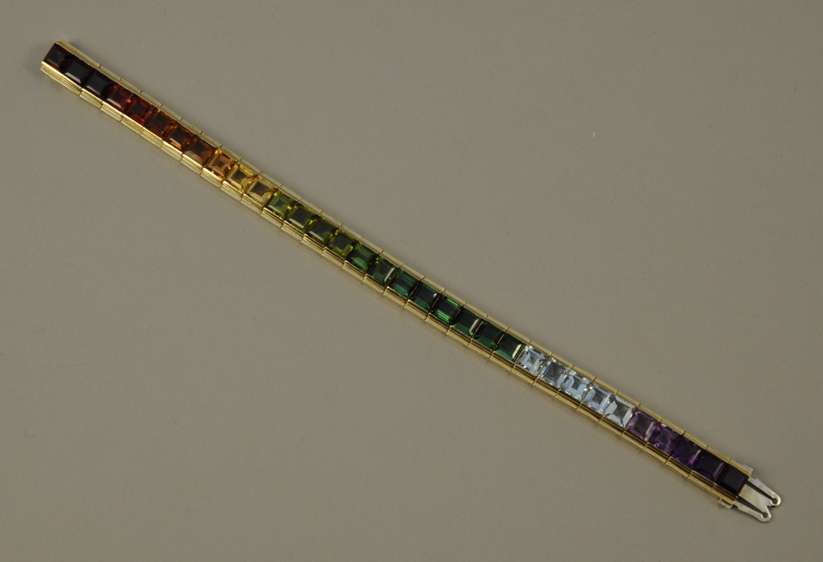 BRACELET articulé en or jaune, serti d'une ligne de trente-trois pierres fines diverses (améthyste, aigue-marine, tourmaline, péridot, citrine et grenat).