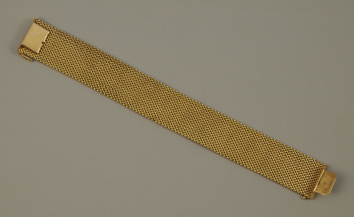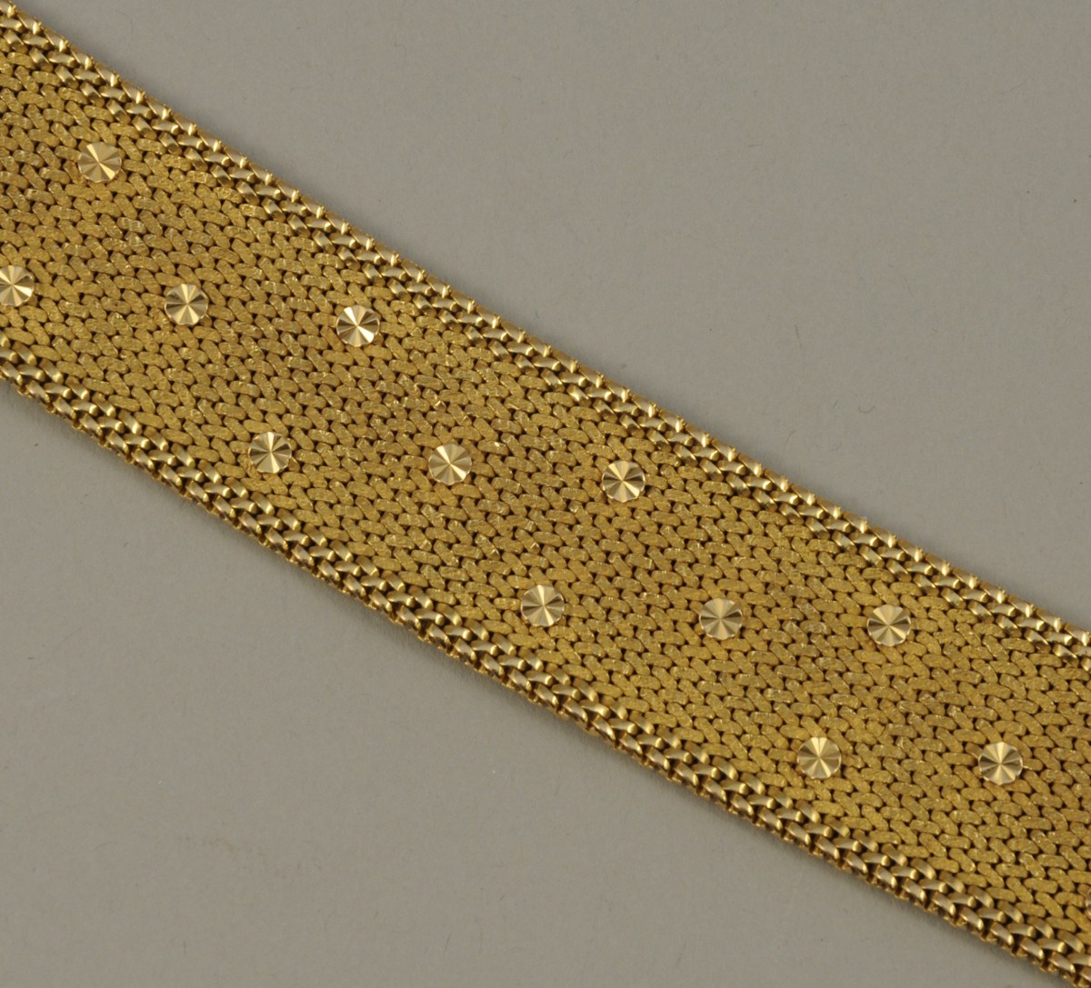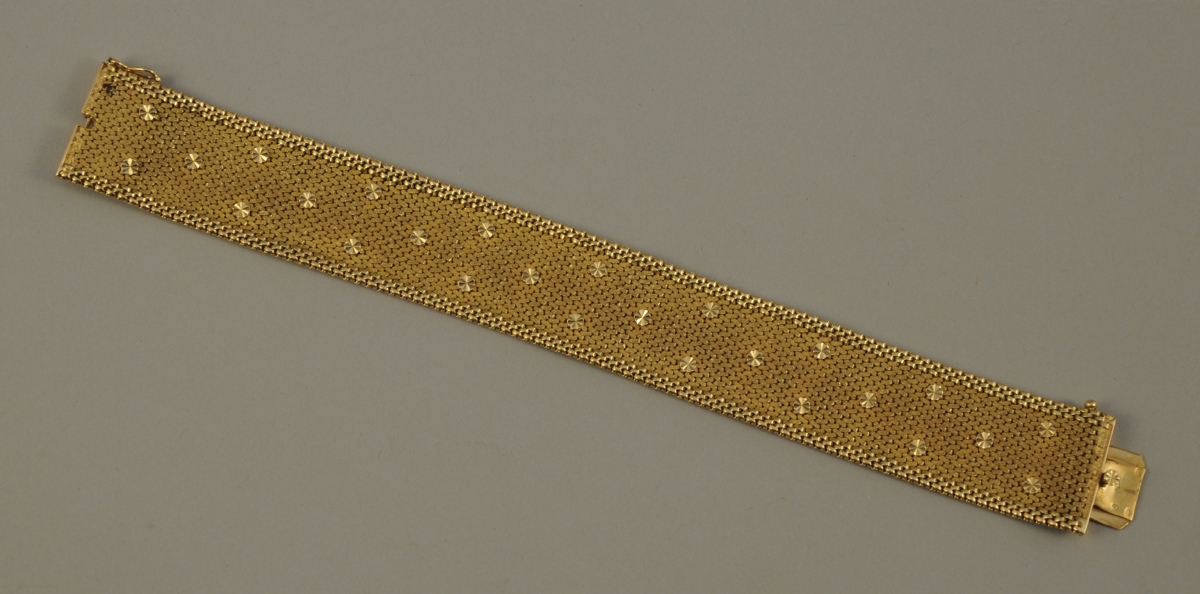 BRACELET large et souple en or jaune tressé, agrémenté de petits motifs fleurettes.