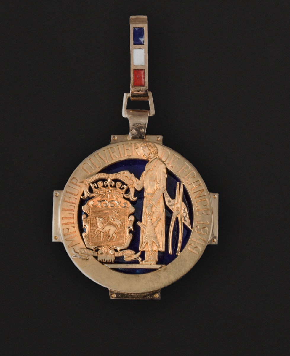 INSIGNE DE MEILLEUR OUVRIER DE FRANCE 1949 pour les Marchands Pelletiers de Soupos Dermine en or émaillé.