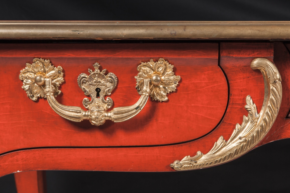 BUREAU PLAT dit "de ministre" en bois de placage relaqué rouge. Il ouvre à trois tiroirs et présente trois faux tiroirs en ceinture. Il repose sur quatre pieds galbés. Dessus ceint d'une lingotière. Riche ornementation de bronze doré tel qu'entrées de serrure, poignées, chutes ornées de mascarons et sabots. Dessus foncé de cuir fauve doré aux petits fers.