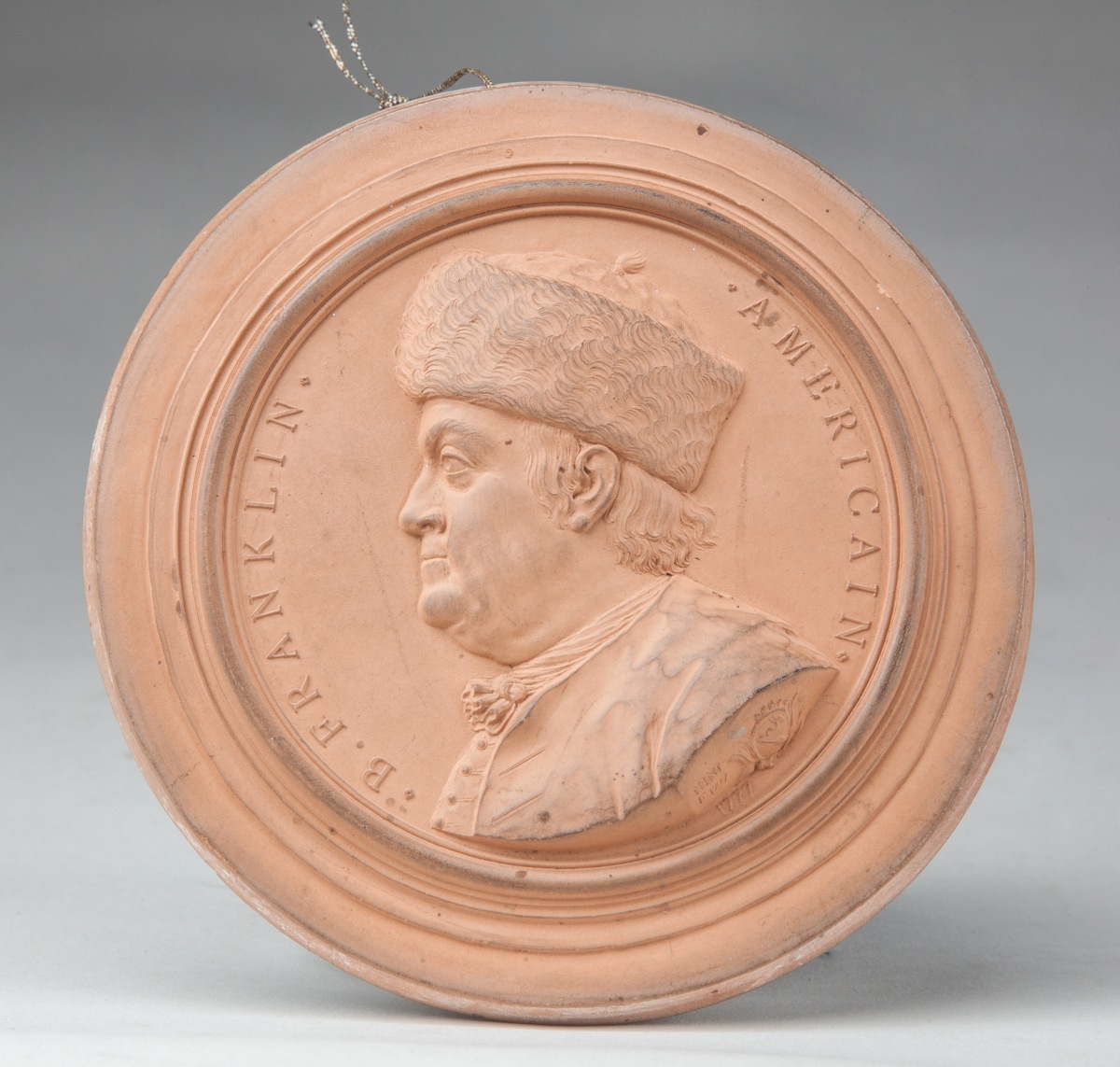 Médaillon en terre-cuite titré, signé et daté deux fois 1777 sous l'épaule avec le blason. Au dos, une fleur de lys en creux.