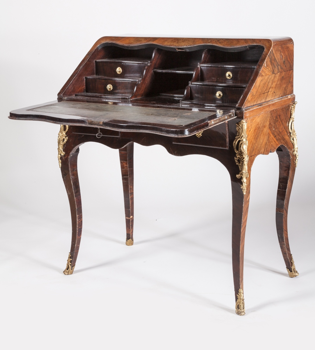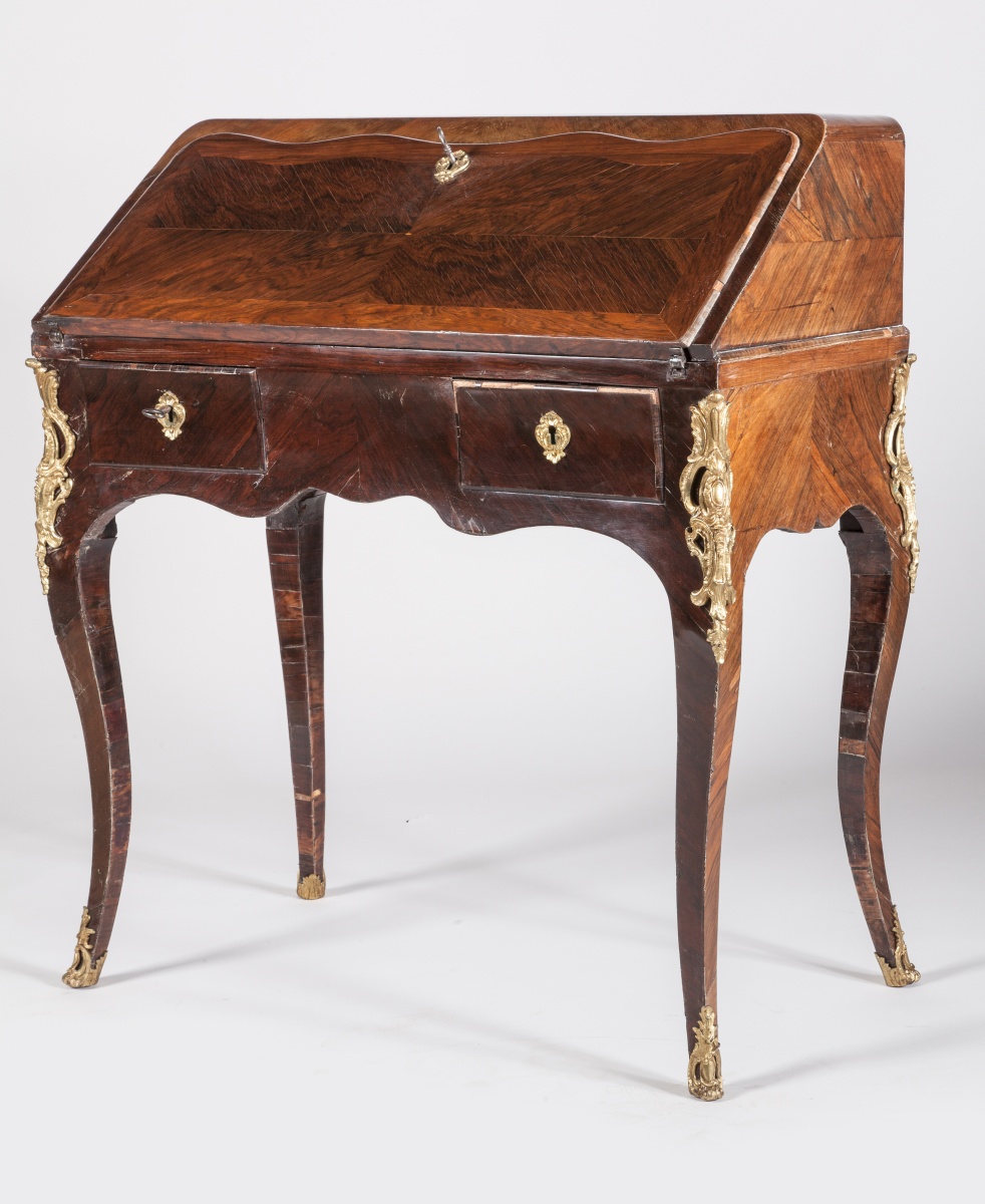 BUREAU DOS D'ÂNE en placage de palissandre toutes faces ouvrant à un abattant et deux tiroirs en ceinture. L'abattant découvre quatre tiroirs en gradin, quatre niches et un secret. Écritoire foncée d'un cuir vert doré aux petits fers. Il repose sur quatre pieds cambrés.
