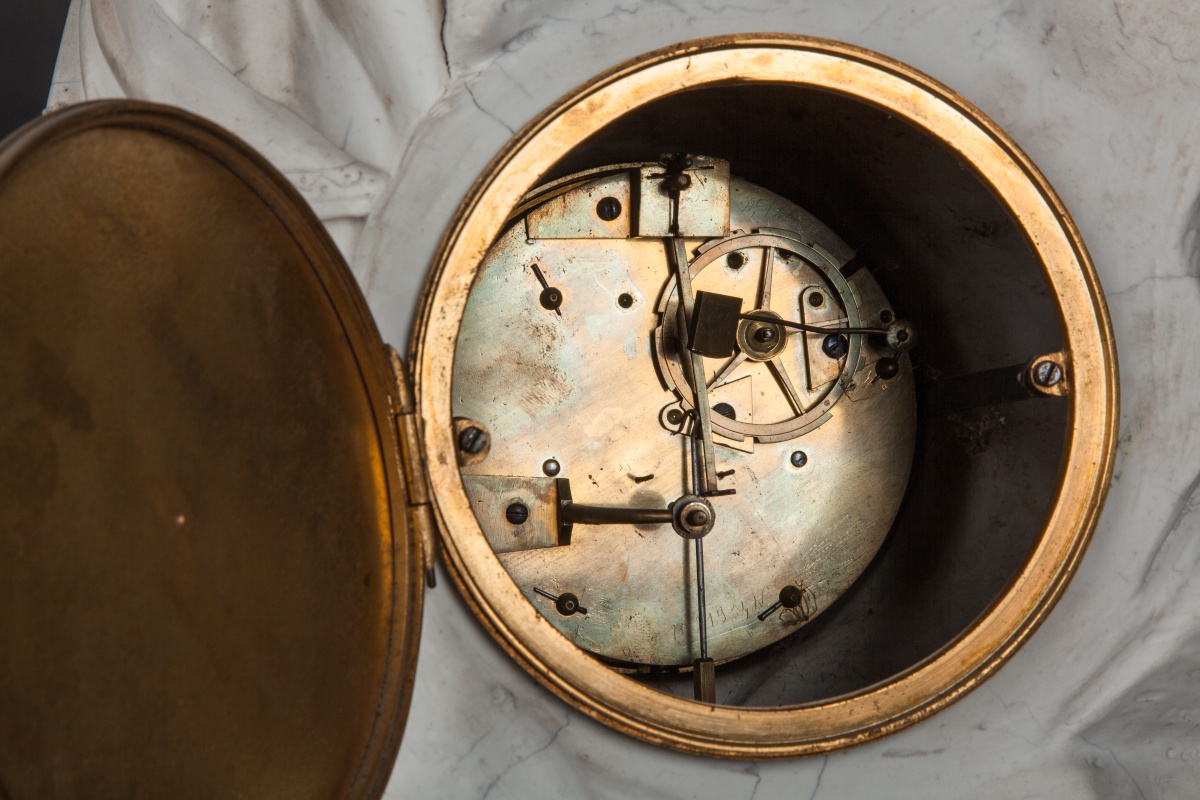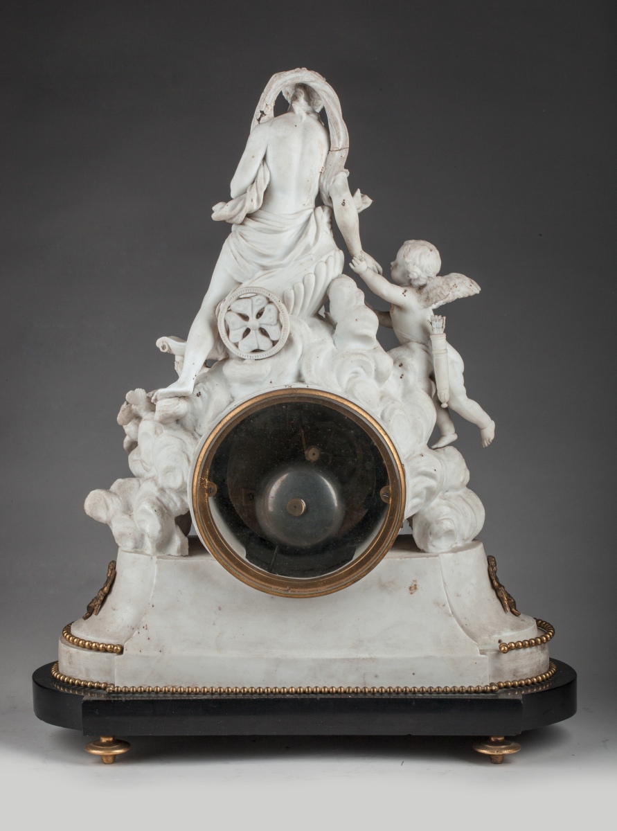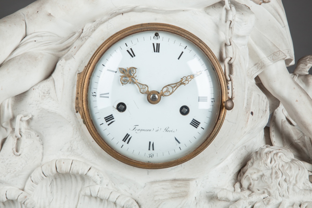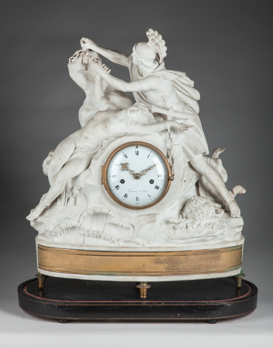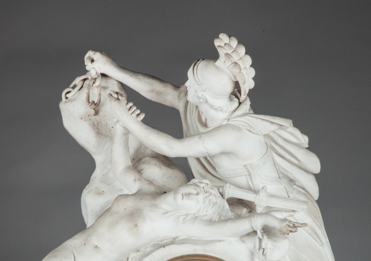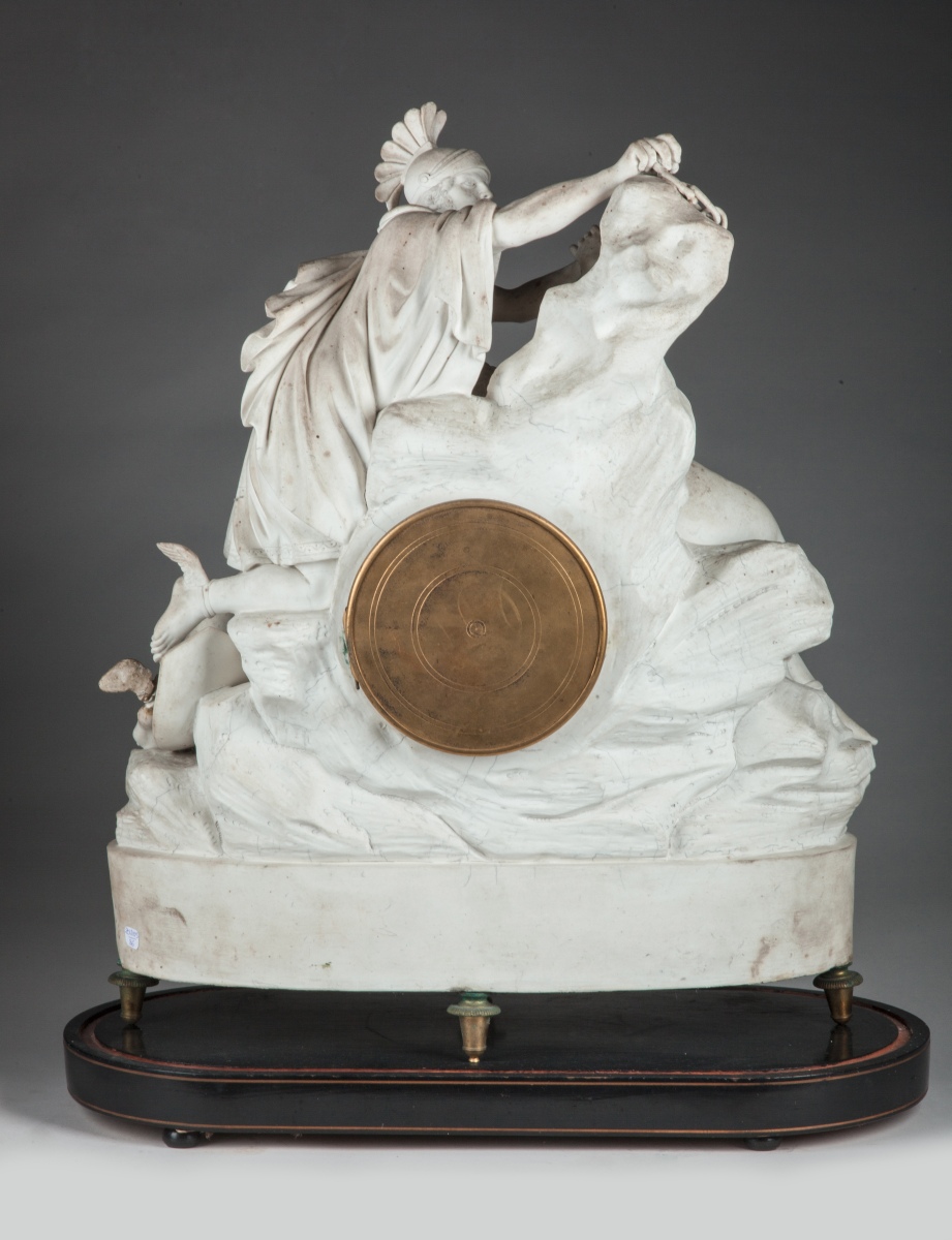 PENDULE en biscuit représentant Roger délivrant Angélique de ses chaînes. Au pied du rocher gît une tête tranchée sur un bûcher ainsi que le bouclier de Roger. La houle remonte le long des flancs du rocher. Base ovale ornée d'un cartouche et d'une frise de boucles en bronze doré. Elle repose sur quatre pieds toupies.