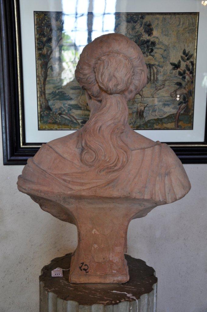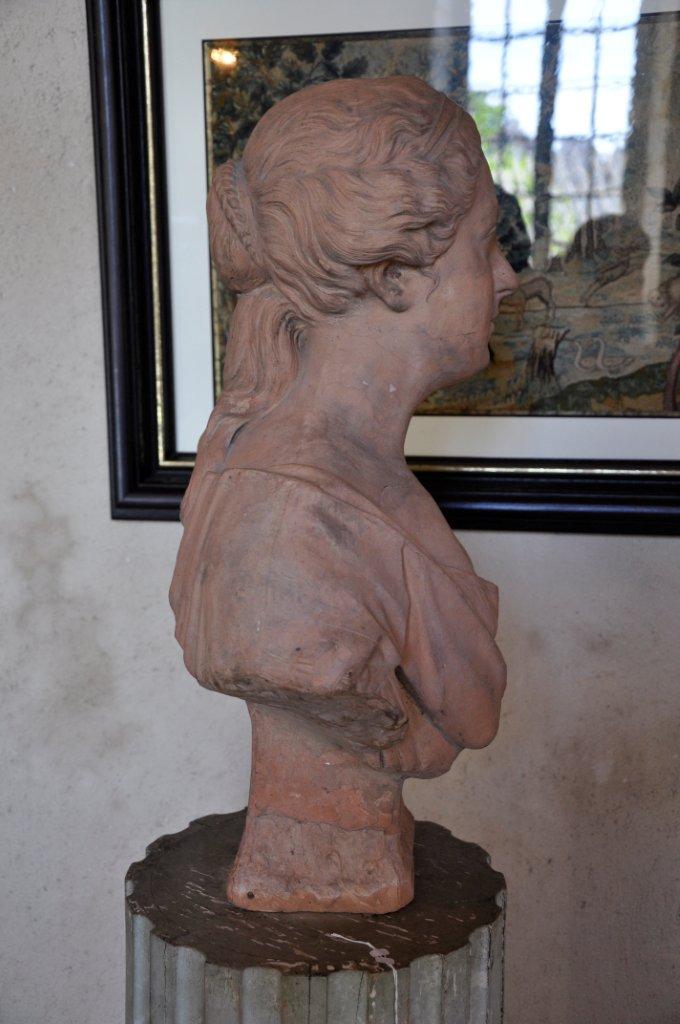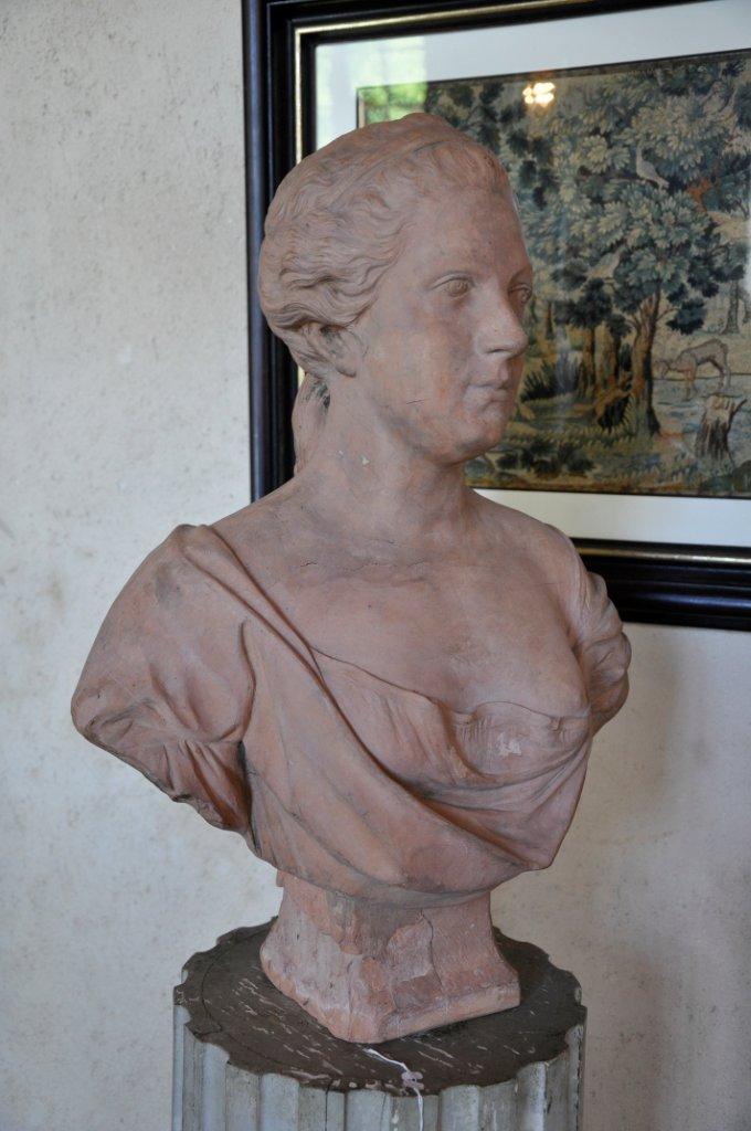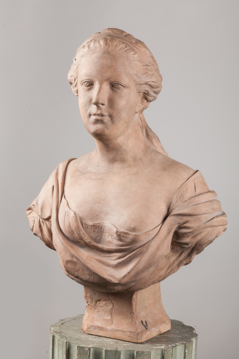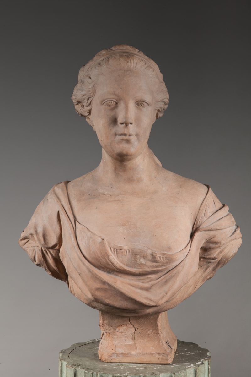 À la demande de grands commanditaires, les portraits sculptés deviennent au XVIIIe siècle des chefs d'oeuvre, à l'égal de la sculpture monumentale. La Marquise de Pompadour prend sous son aile Jean-Baptiste Pigalle, qui lui livre un premier portrait en buste en 1751. Travaillant également pour le château des Ormes appartenant au marquis d'Argenson, Pigalle représente à nouveau la Pompadour en 1753. Elle est en pied, dans un pendant à la sculpture de Louis XV, pour le parc du château de Bellevue, dans une figure allégorique intitulée "L'amitié sous les traits de Mme de Pompadour", aujourd'hui au musée du Louvre. Les cheveux noués de la femme sur ce buste rappellent ceux de cette oeuvre: "La physionomie est fine et gracieuse ; on y reconnait à la fois l'expression de tendresse et celle de l'esprit le plus délicat ; ses cheveux décorent les tempes de leurs ondulations ; ils sont ramenés à l'aide d'un léger ruban qui passe sur le devant de la tête, formant une couronne nattée, et tombent par derrière en flots élégants. " in Prosper Tarbé, "La vie et les oeuvres de Jean-Baptiste Pigalle", éd. Renouard, Paris, 1859, pp. 57, 58.