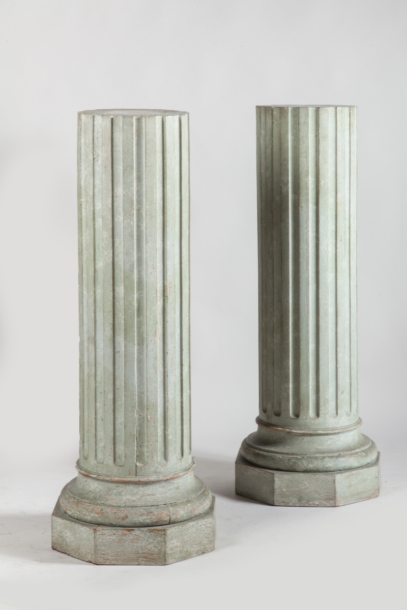 PAIRE DE SELLETTES en bois sculpté, mouluré et laqué gris perle. Elles adoptent la forme d'une colonne cannelée reposant sur une base octogonale.