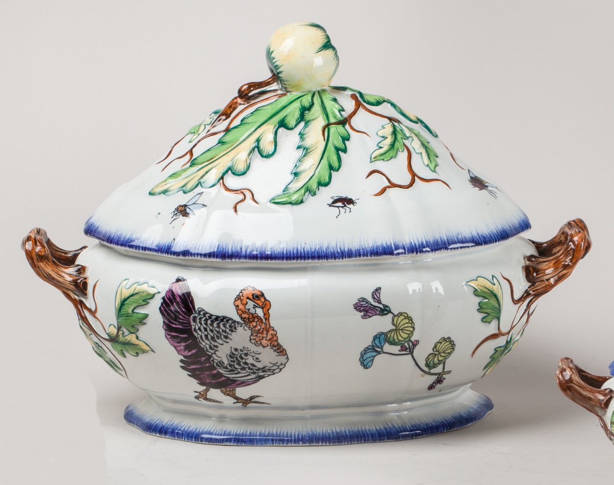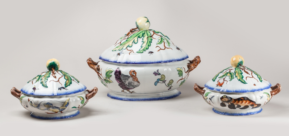 PARTIE de SERVICE "ROUSSEAU" en faïence fine comprenant une soupière et deux légumiers. Décor polychrome sur fond blanc de dindon, oie, poisson, insectes et feuillages de style japonisant. Les fretels en forme de pomme, les anses à l'imitation de branchages. Peignés bleus sur le bord. Marque au tampon au revers.
