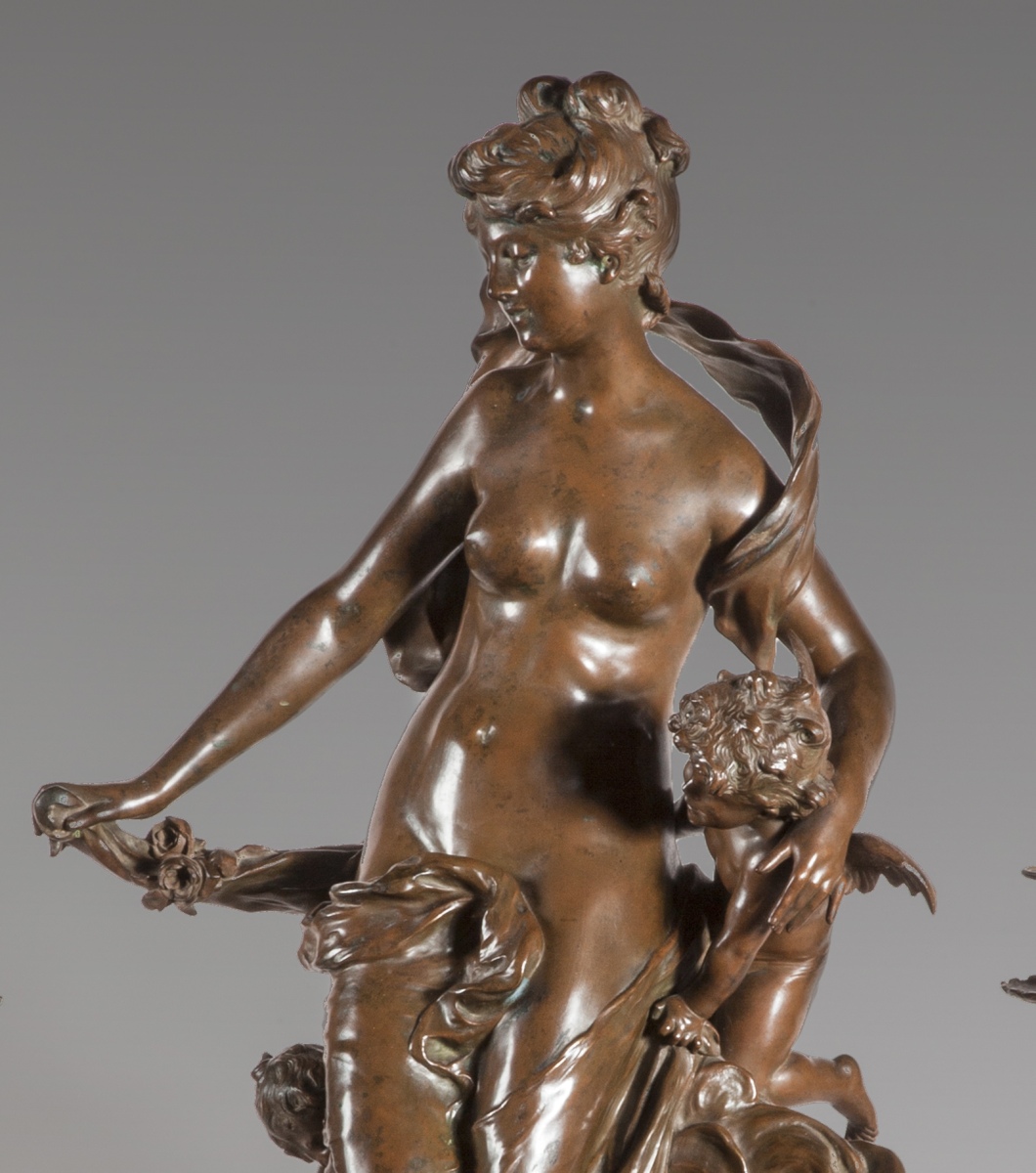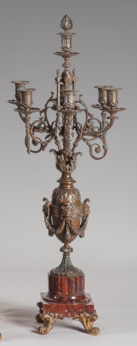 GARNITURE de CHEMINÉE comprenant une pendule et une paire de riches girandoles à sept lumières en bronze patiné, sur des socles de marbre griotte rouge. La pendule est surmontée d'une statue en bronze patiné d'Auguste MOREAU (1834-1917) représentant "Enlèvement de Psyché".