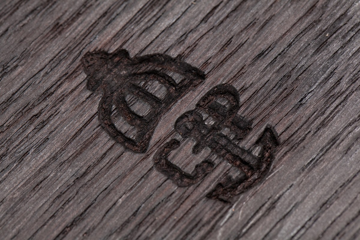 Marques au fer du Château de Chanteloup: CP séparés par une ancre sous une couronne fermée au revers du couvercle et sous le caisson.