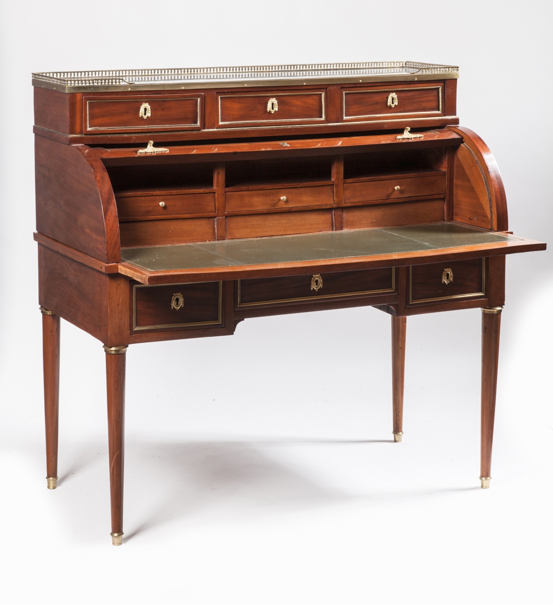 BUREAU à CYLINDRE en acajou et placage d'acajou. Il ouvre par trois tiroirs en partie supérieure et trois tiroirs en ceinture. Le cylindre découvre un intérieur garni de trois tiroirs et trois casiers. Il repose sur quatre pieds fuselés. Dessus de marbre gris Saint-Anne.