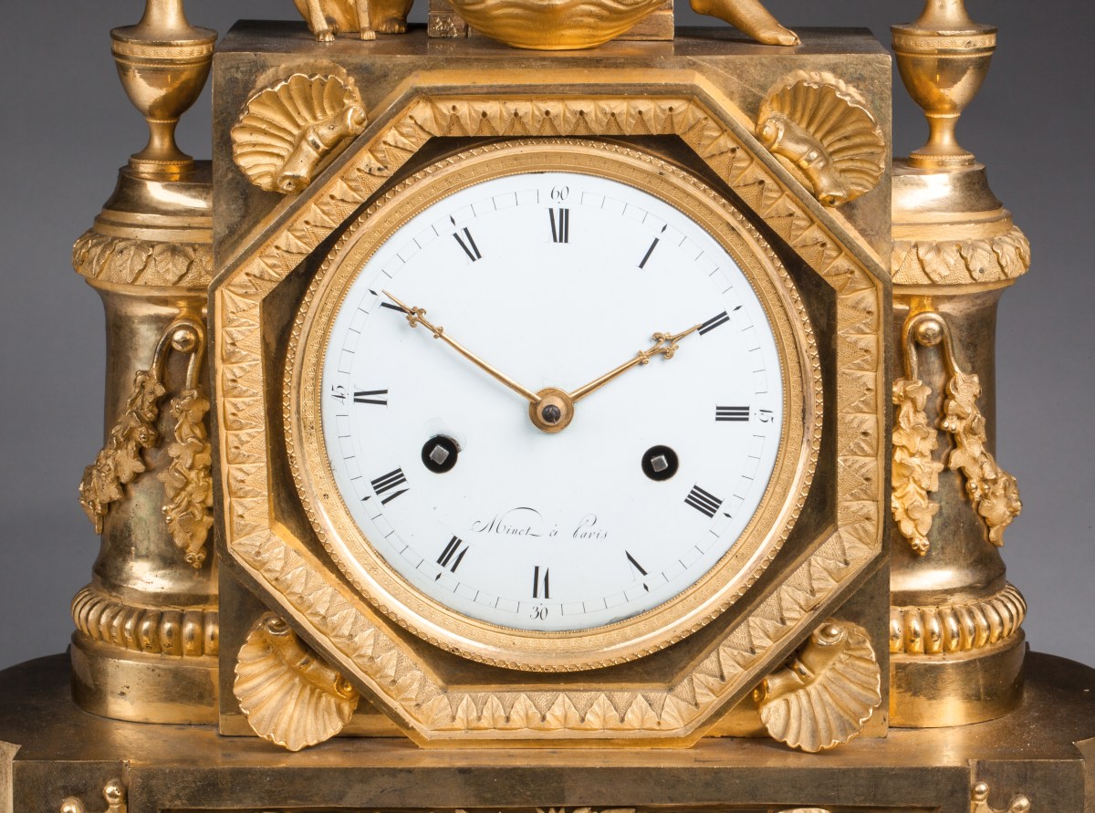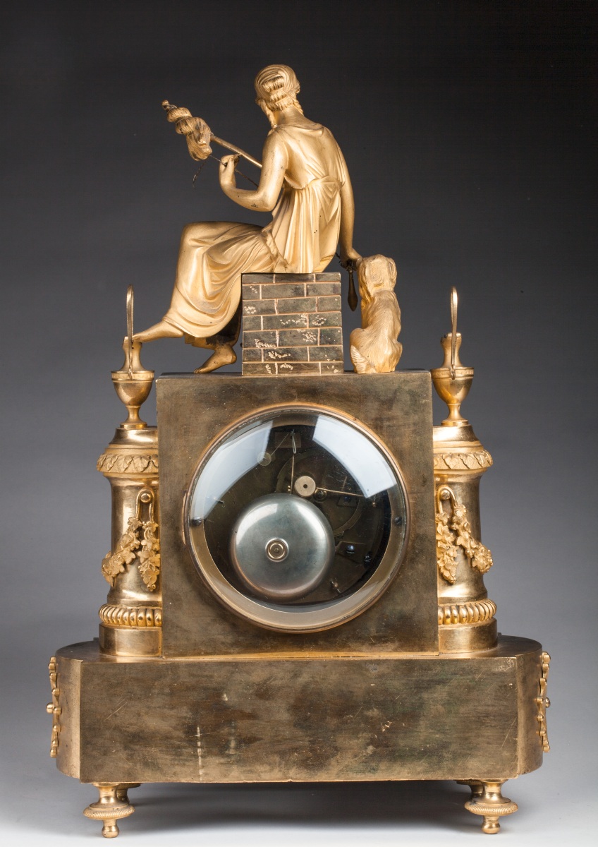 PENDULE en bronze ciselé et doré figurant une Parque filant assise sur une fontaine au masque de faune et accompagnée d'un chien. Le cadran s'inscrit dans une caisse rectangulaire, il est souligné d'un entourage octogonal orné d'une frise de feuilles d'acanthe et de quatre coquilles en écoinçons. Sur les côtés, deux demi-colonnes ornées de godrons, guirlandes feuillagées et feuilles d'acanthe. Elles sont sommées de deux aiguières. La base rectangulaire à côtés cintrés et ressaut central