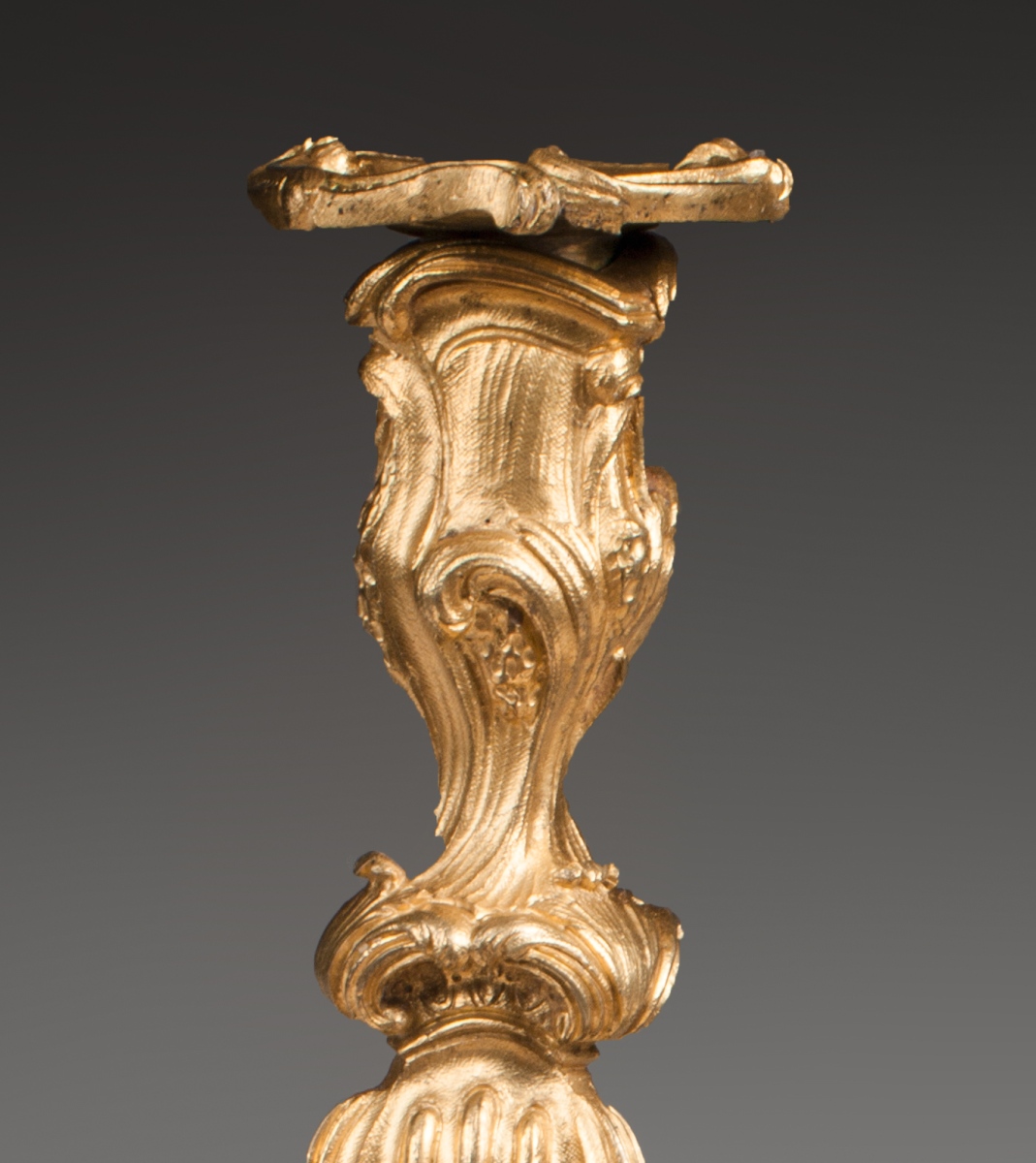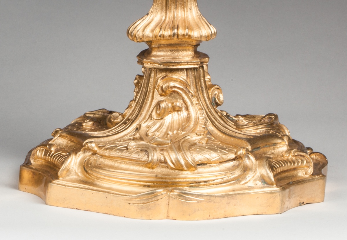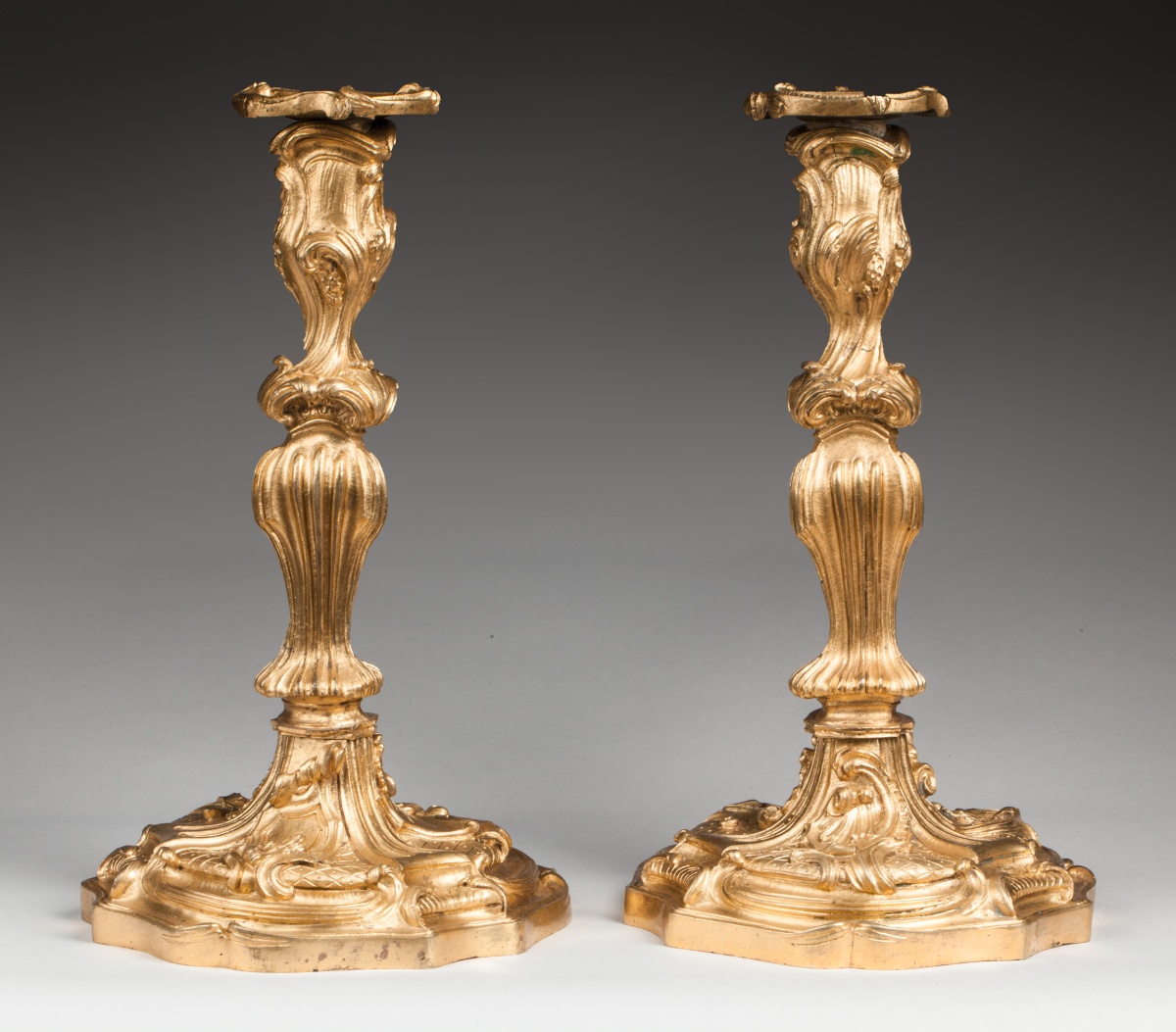 Paire de FLAMBEAUX en bronze ciselé et doré. Ornementation de style Rocaille telle que cartouches, enroulements, feuilles d'acanthe stylisées et croisillons.