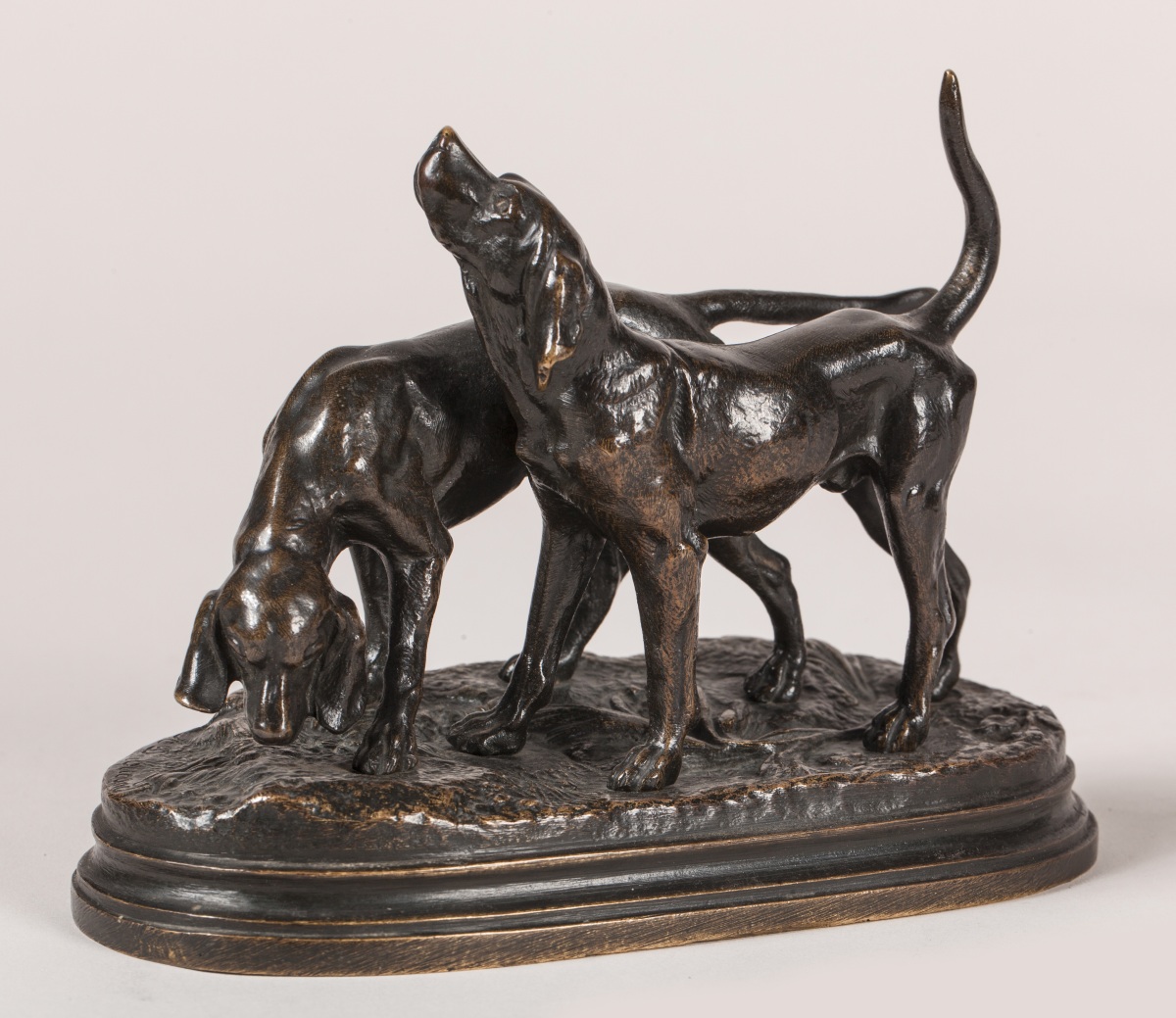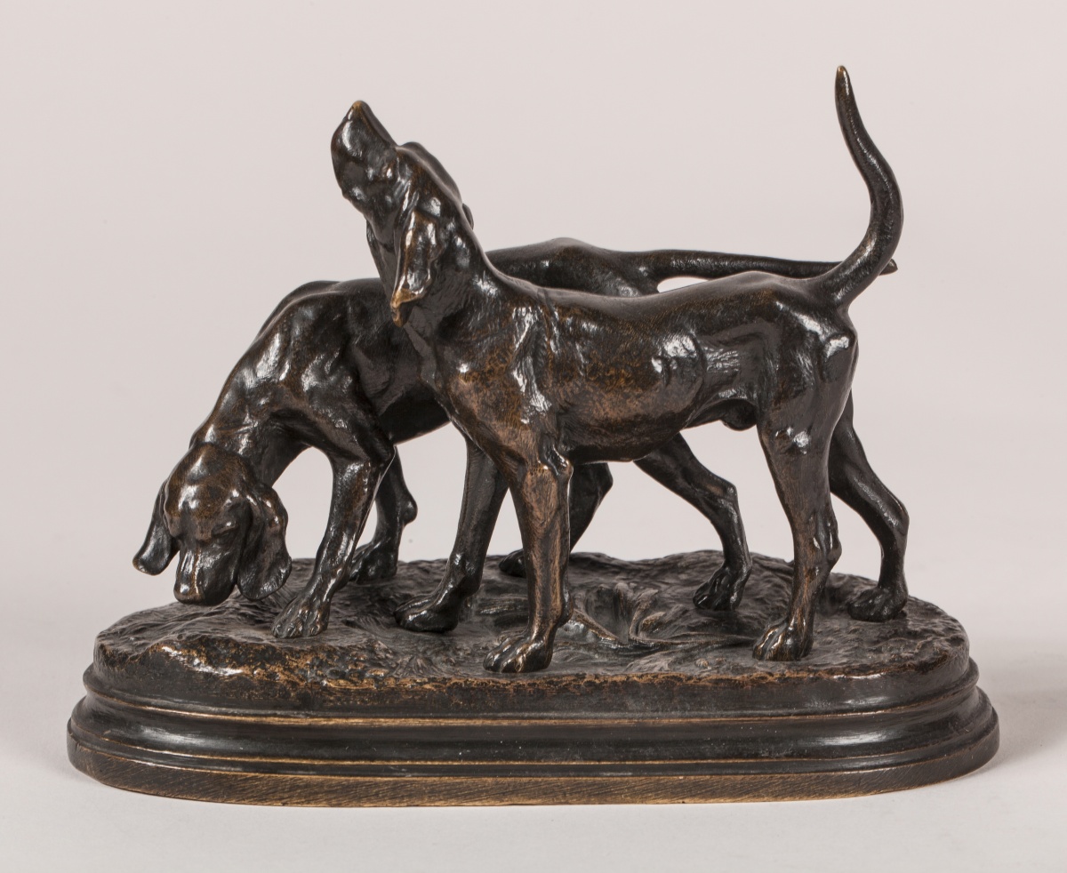 Alfred DUBUCAND (Paris, 1828-1894)Chiens suivant la trace.Bronze patiné, signé sur...