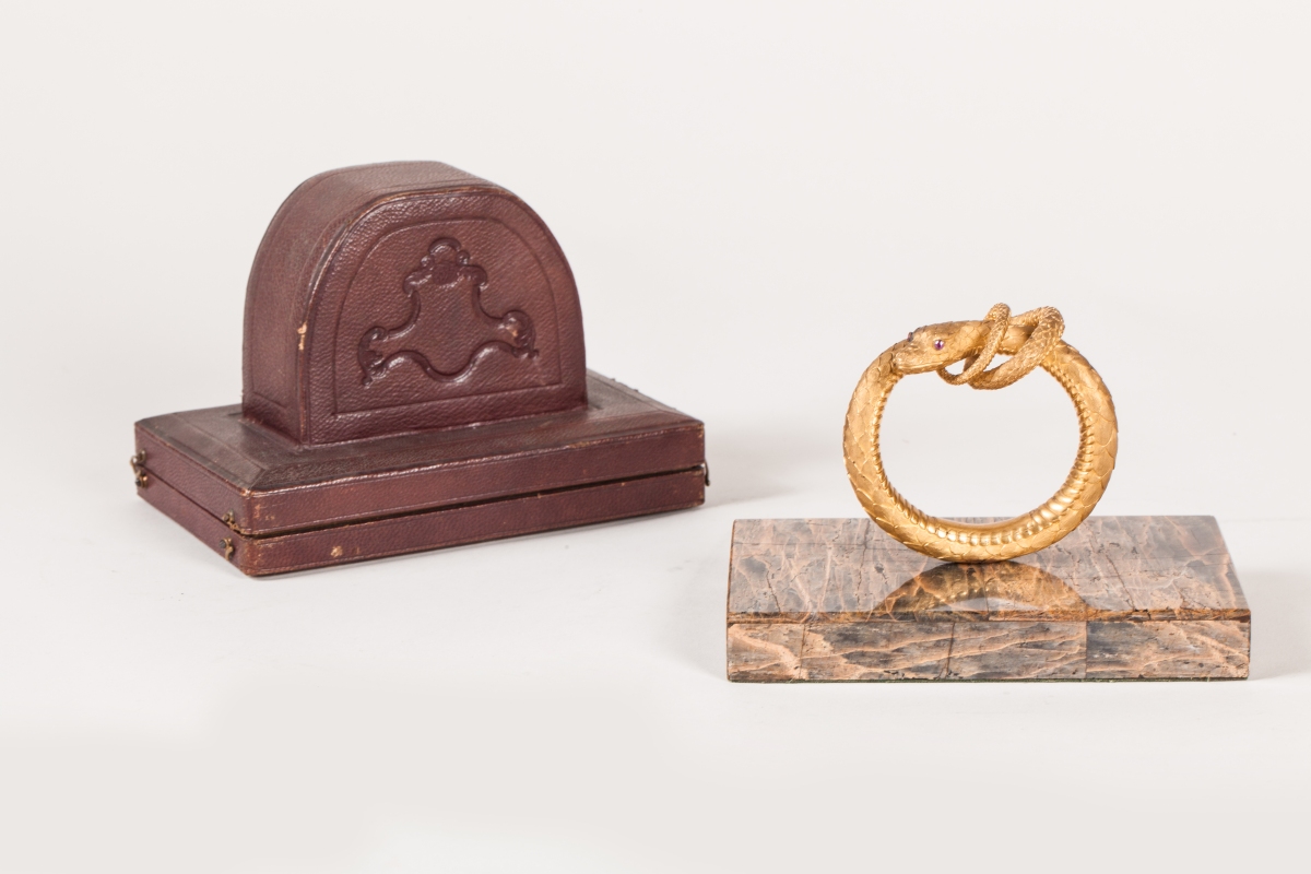 PRESSE-PAPIER en bronze doré représentant un serpent, la queue enroulée autour de son cou. Les yeux en grenats (?) facettés. Il recèle un petit compartiment rectangulaire ouvrant. Base rectangulaire plaquée de pierres gris veiné ocre.