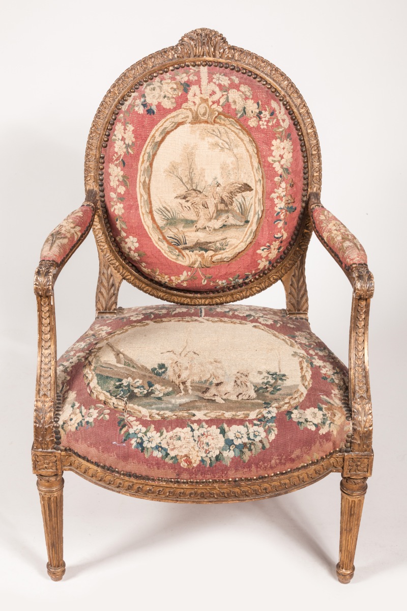 Les dossiers et les assises garnis en TAPISSERIE d'AUBUSSON polychrome du XVIIIe siècle. Elle reçoit un décor d'oiseaux et d'animaux des fables de La Fontaine s'inscrivant dans des médaillons aux alentours fleuris.
