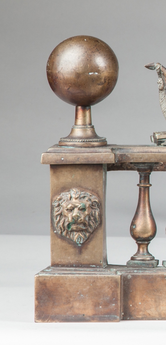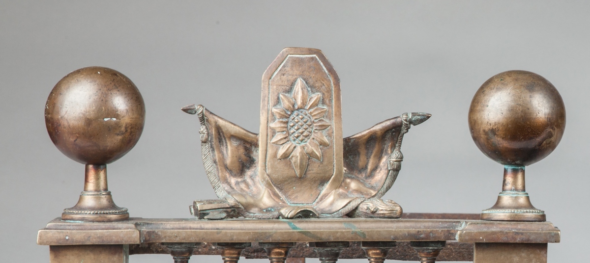 PAIRE DE FEUX en bronze et fer forgé. Ils figurent une galerie de balustres surmontée d'un trophée d'armes et drapeaux, portés sur une plinthe. La galerie flanquée de deux gaines ornées d'un masque léonin et sommées d'une sphère.