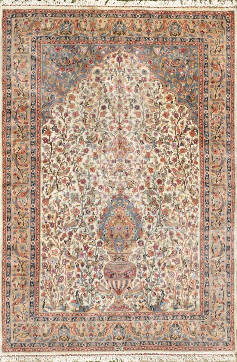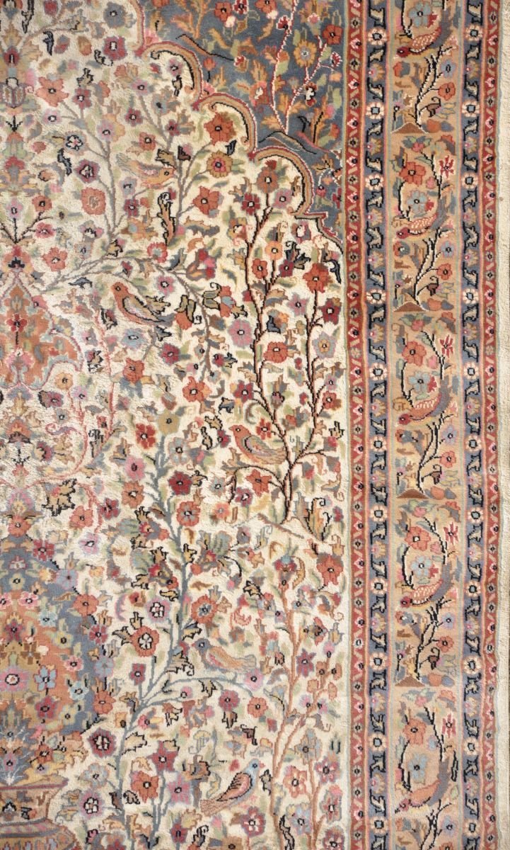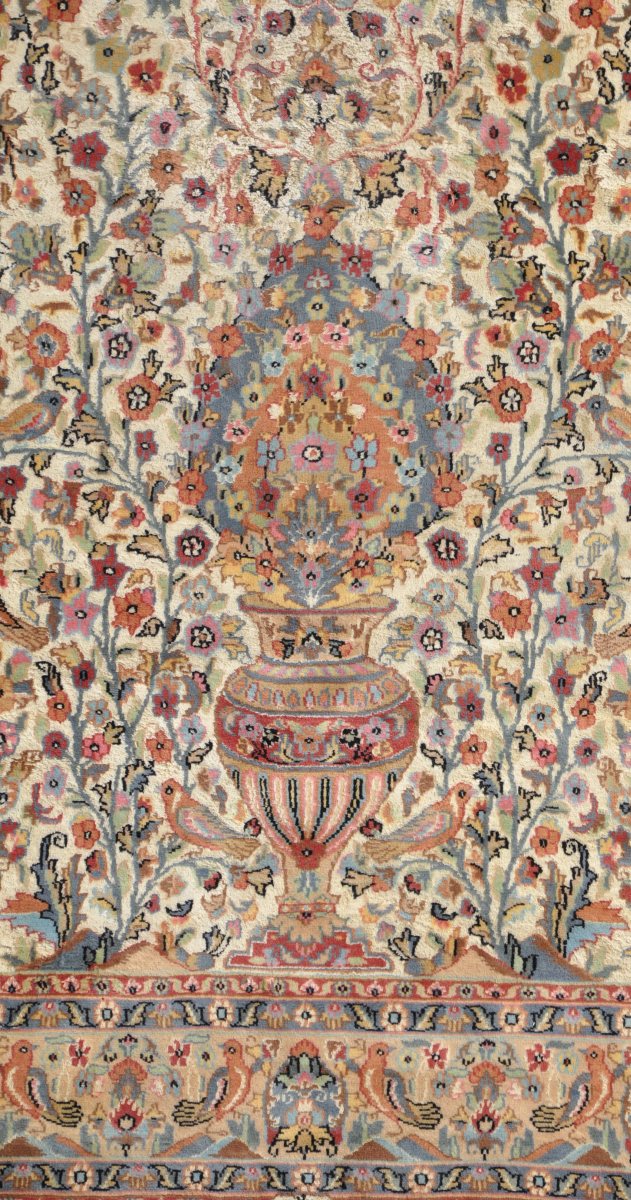 TAPIS persan en laine à motif de vase fleuri et d'oiseaux branchés sur fond crème. Bordure à fond beige à décor d'oiseaux, fleurs et feuillages.