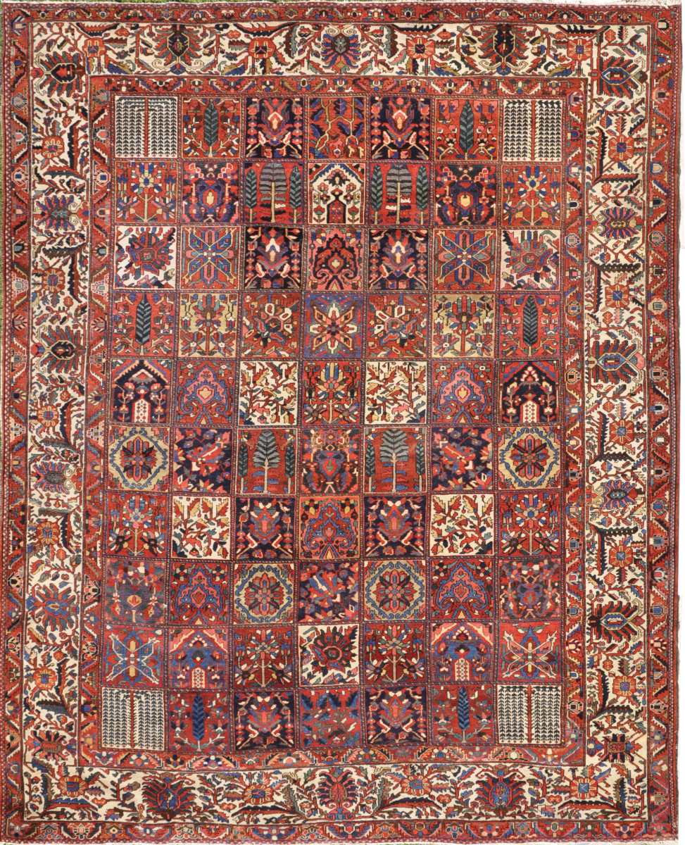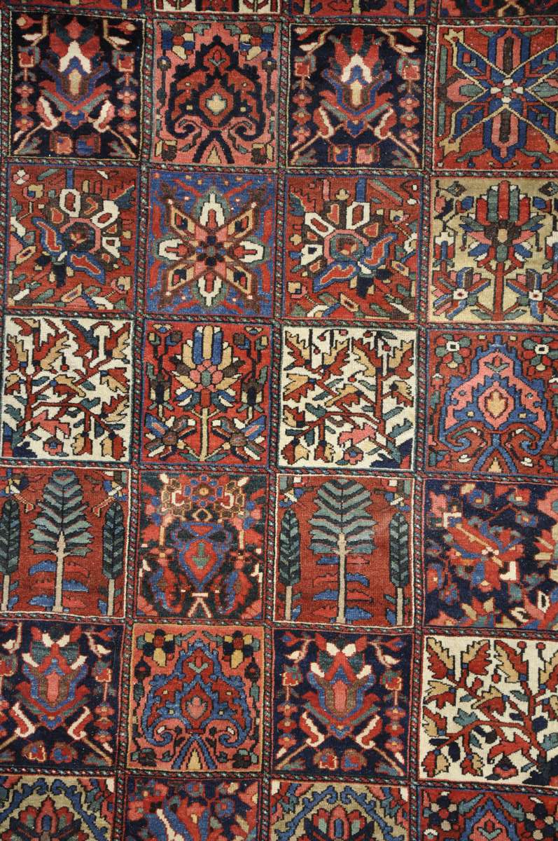 Grand TAPIS Bakthiar en laine à décor de 70 caissons à fond rouge, bleu ou crème au motif bid majnum ou saule pleureur, cyprès et branchages fleuris. Large bordure crème à décor de motifs feuillagés entre deux contre bordures rouges.