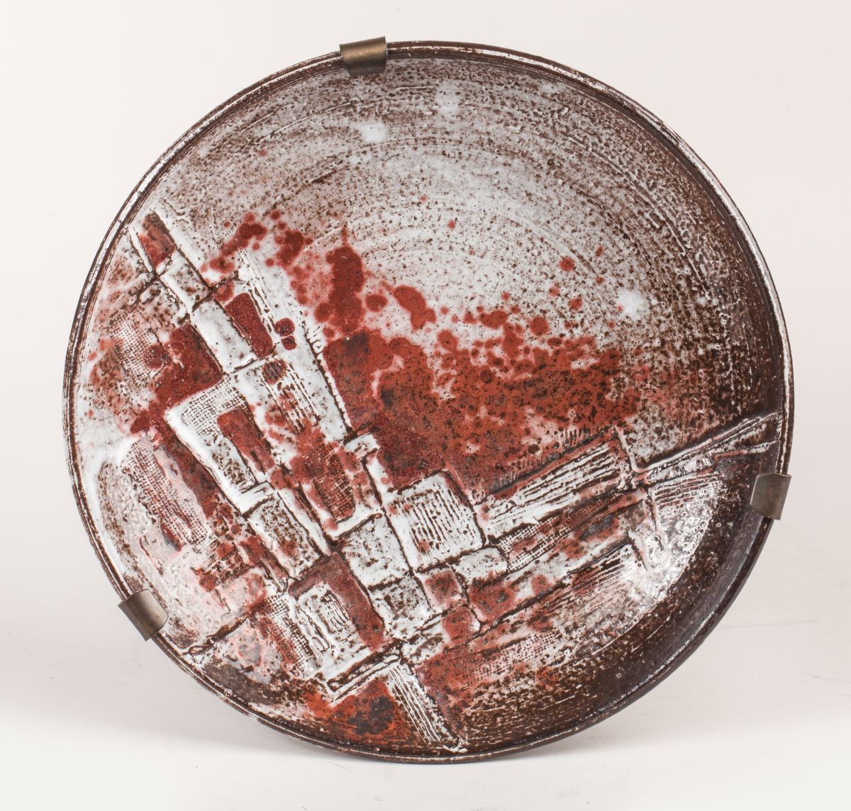 Grand PLAT de forme circulaire en céramique, à décor estampé de ton rouge.