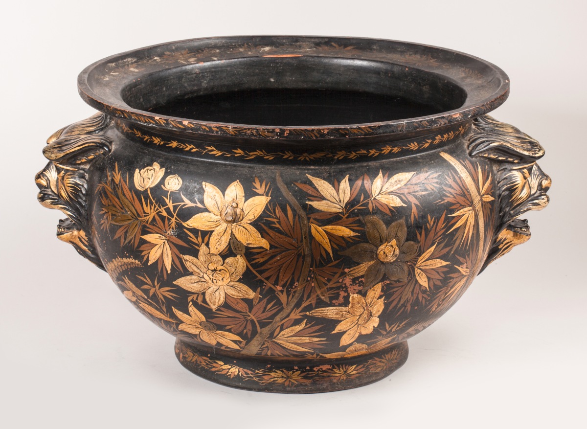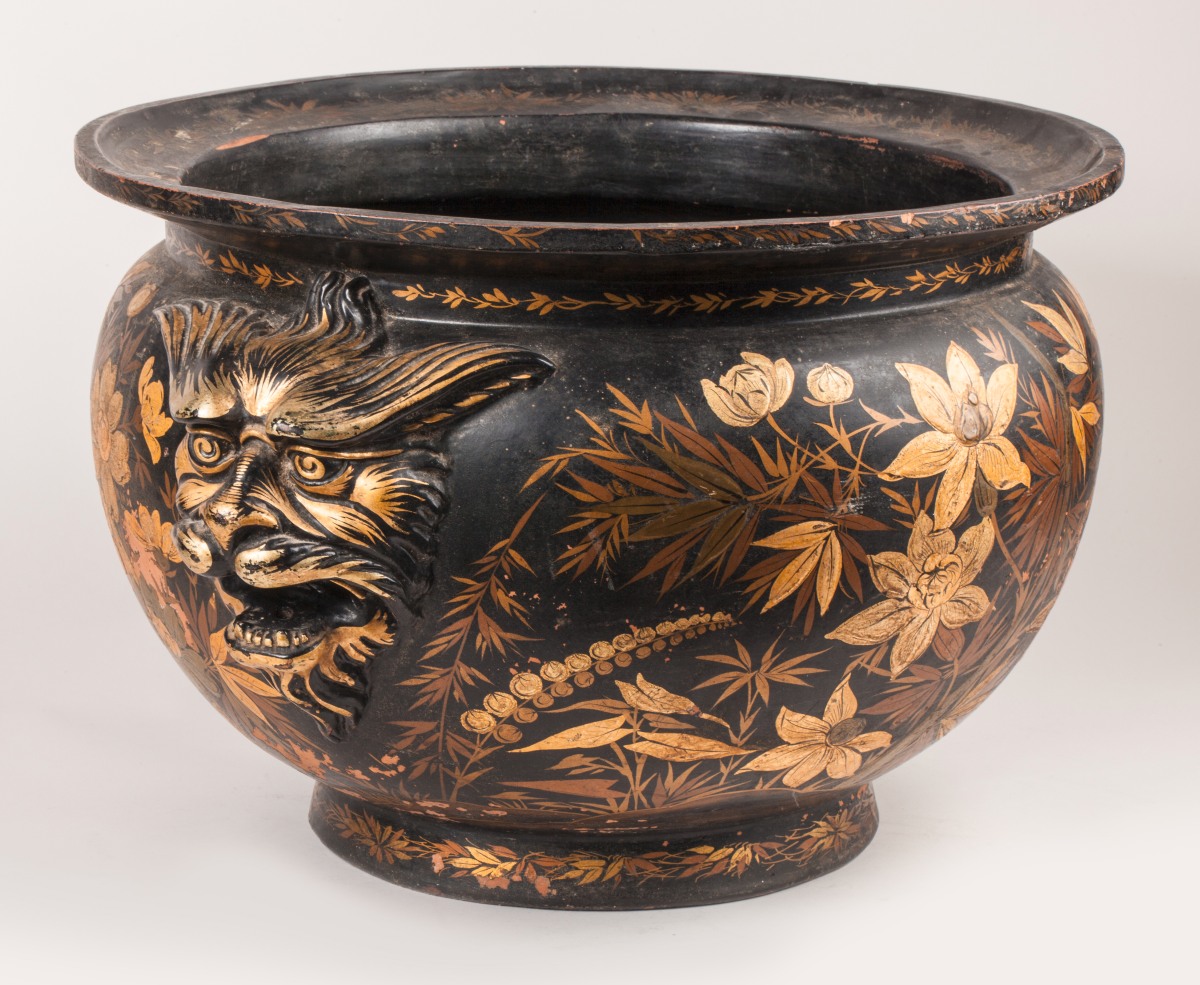 Céramique à l'imitation du laque à décor japonisant de chrysanthèmes or sur fond noir. Prises en forme de tête de félin monstrueux.