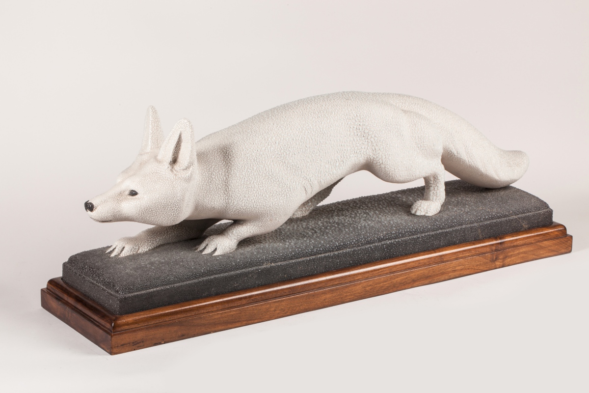Céramique à couverte émaillée blanche perlée pour le renard et grise pour la base.