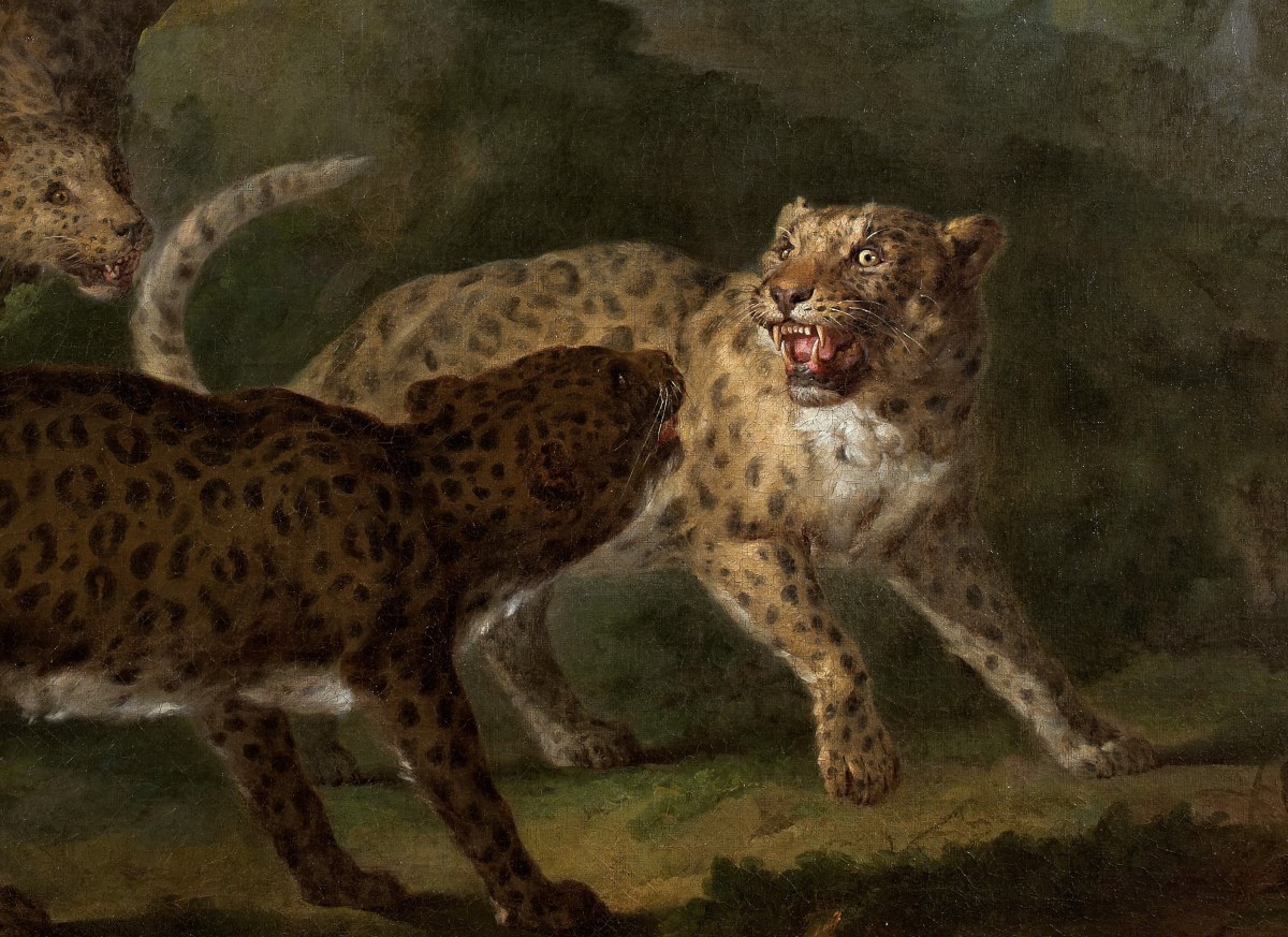 C'est Jean-Baptiste Oudry, peintre de la ménagerie du roi Louis XV, qui présenta Jean-Jacques Bachelier à l'Académie Royale. Reconnu pour ses talents de peintre animalier, c'est à lui que l'on fait appel après le décès de Jean-Baptiste Oudry pour représenter les trophées les plus spectaculaires des chasses de Louis XV puis de Louis XVI. La douceur des coloris et la composition de l'arrière-plan de ces trois panthères peuvent être mis en rapport avec "Un lion attaqué par des chiens" ( toile, 45 x 54 cm, coll. part. cf. [Expo. Versailles,1999] Jean-Jacques bachelier, peintre du roi et de Madame de Pompadour, Cat. A 12 p. 189, repr.)