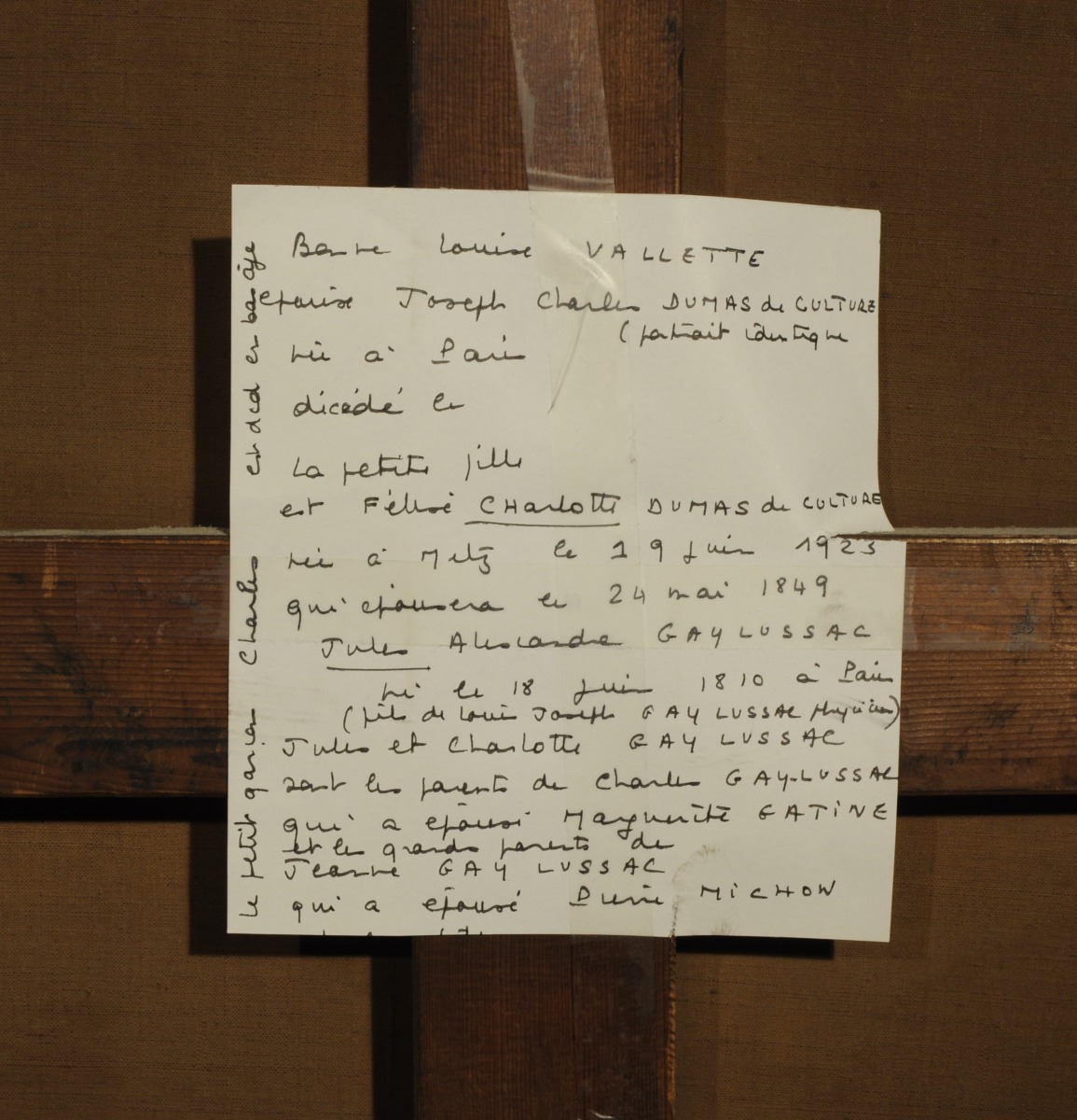 Louise Valette épouse Joseph Charles Dumas de Culture (portrait identique) né à Paris décédée le/ la petite fille Félicie Charlotte Dumas de Culture née à Metz le 19 juin 1923 (sic) qui épousera le 24 mai 1849 Jules Alexandre Gay-Lussac né le 18 juin 1810 à Paris ( fils de Louis Josef Gay-Lussac physicien)