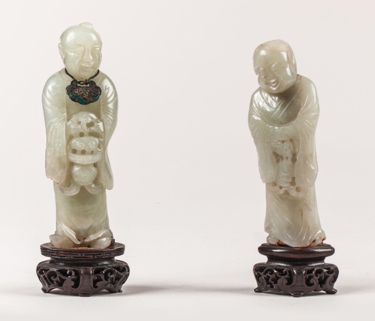 Deux STATUETTES DE HEHE DEBOUT en néphrite céladon clair l'un tenant une boîte, l'autre tenant un panier de lingzhi.