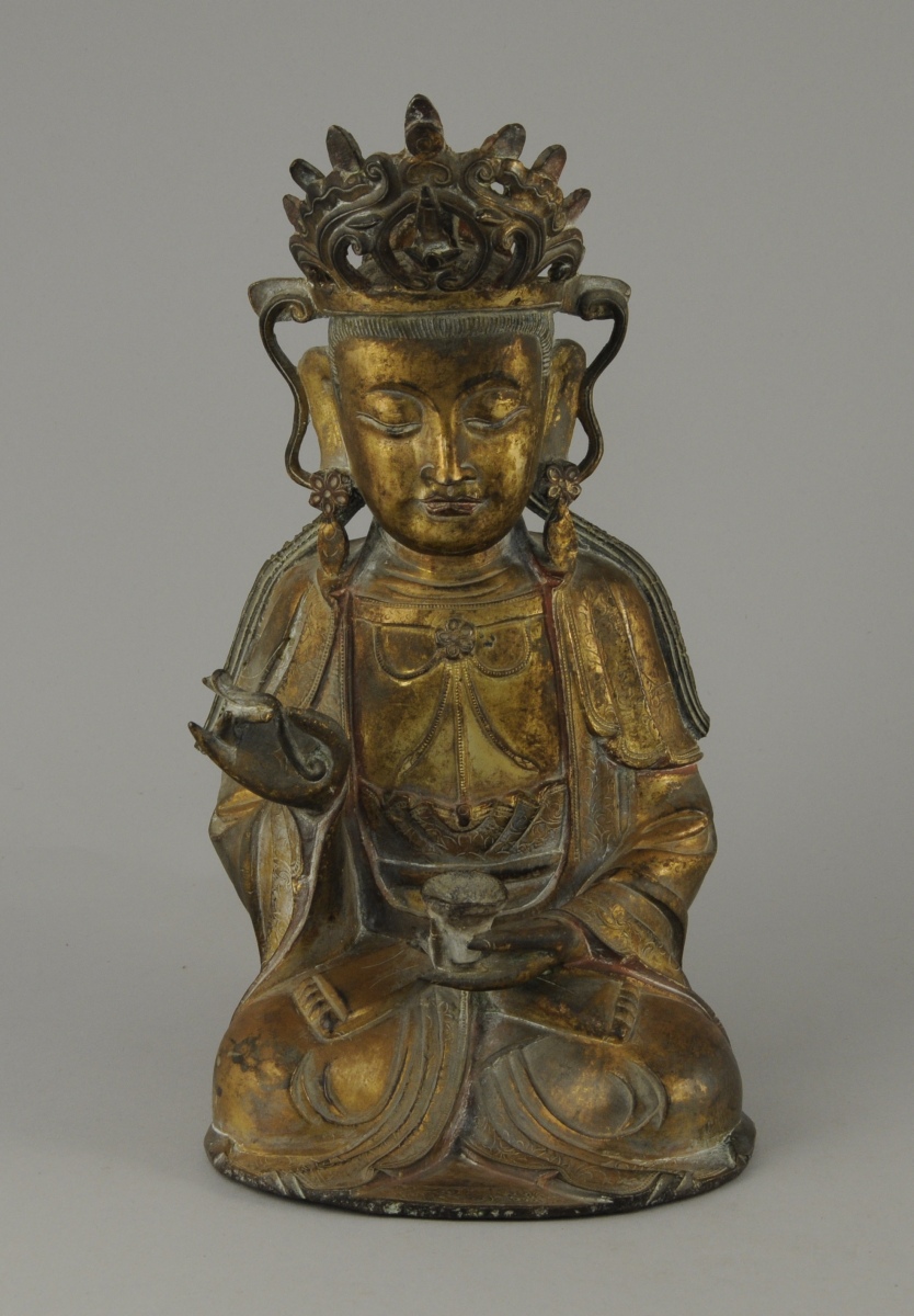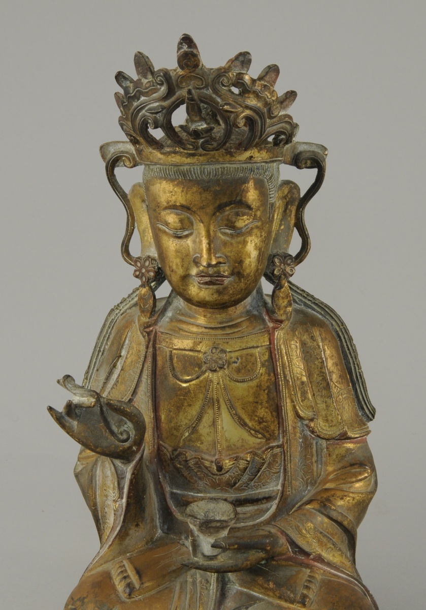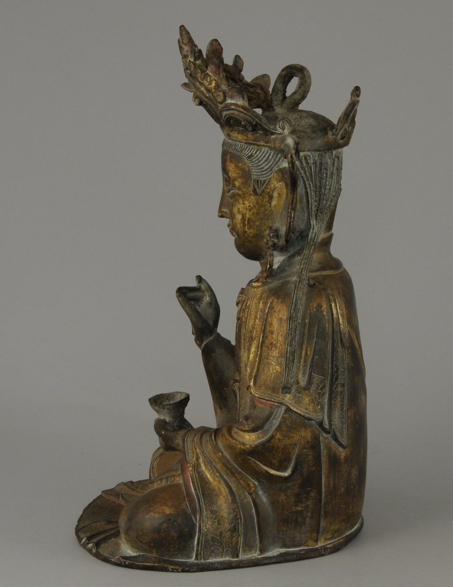 en bronze doré, assis en padmasana tenant dans sa main gauche un bol à aumônes et de sa main droite une tige, il est coiffé d'une haute couronne ornée de l'image du bouddha, portant des boucles d'oreilles en forme de fleurs.