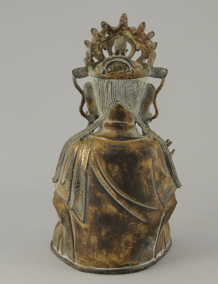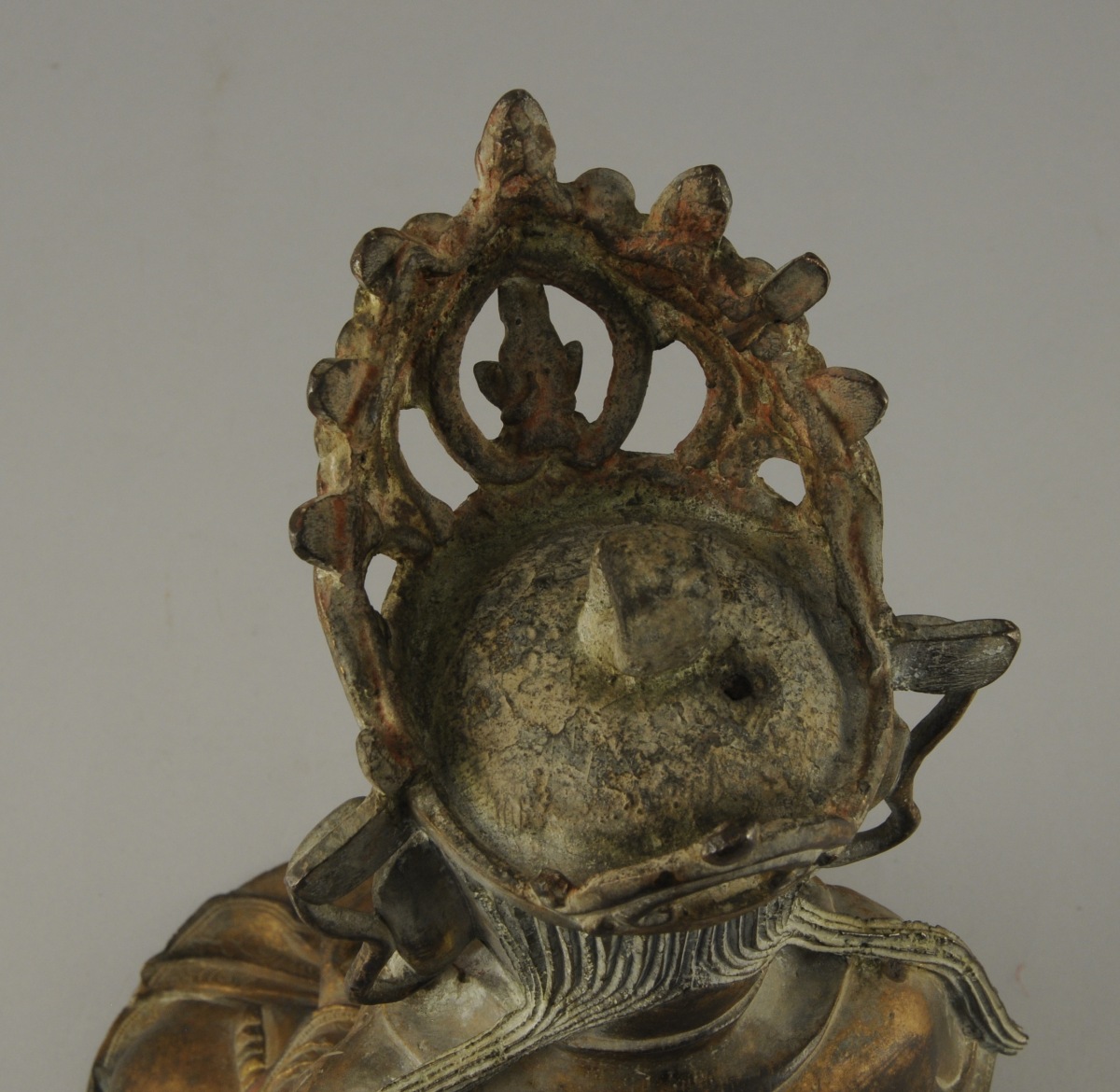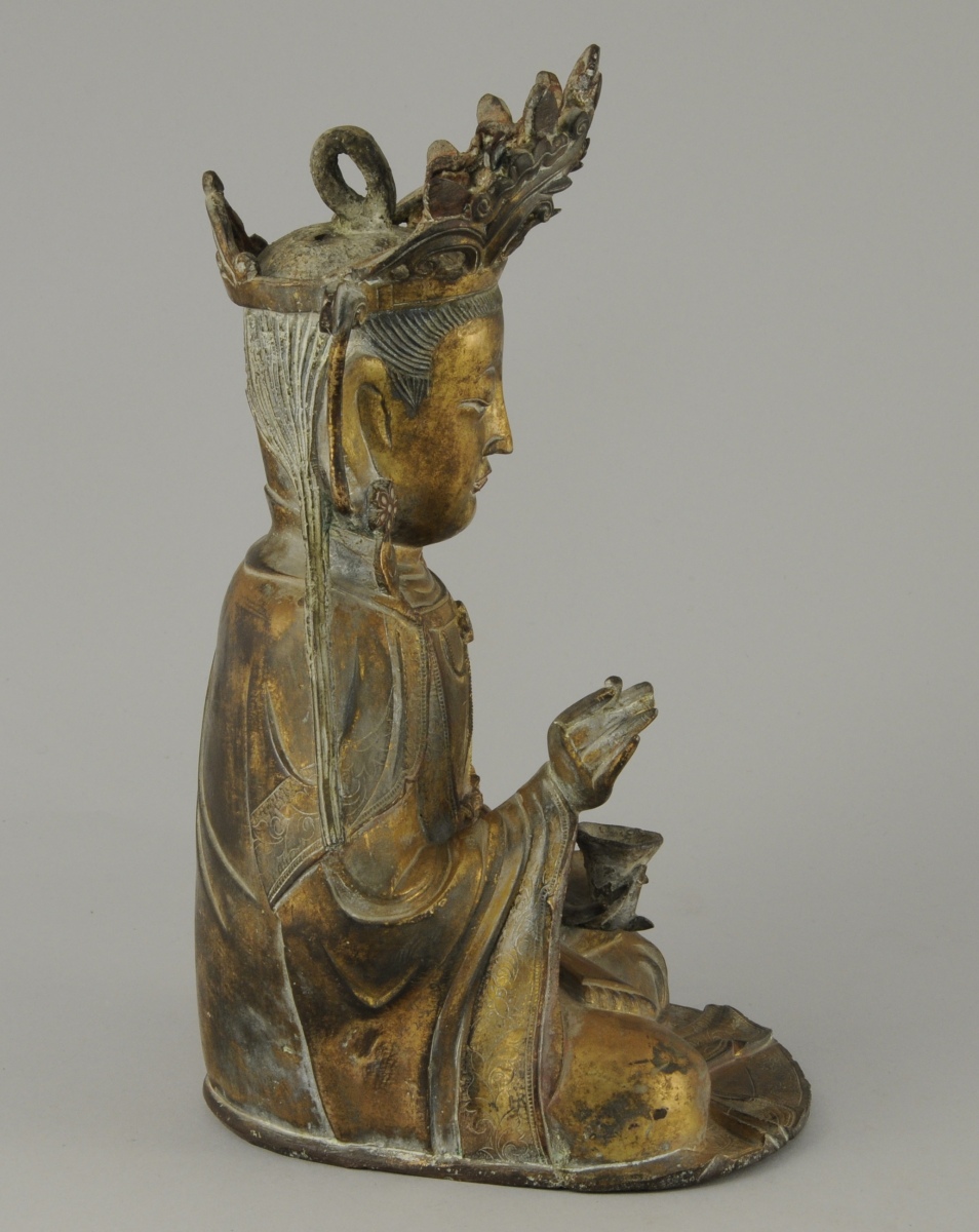 en bronze doré, assis en padmasana tenant dans sa main gauche un bol à aumônes et de sa main droite une tige, il est coiffé d'une haute couronne ornée de l'image du bouddha, portant des boucles d'oreilles en forme de fleurs.