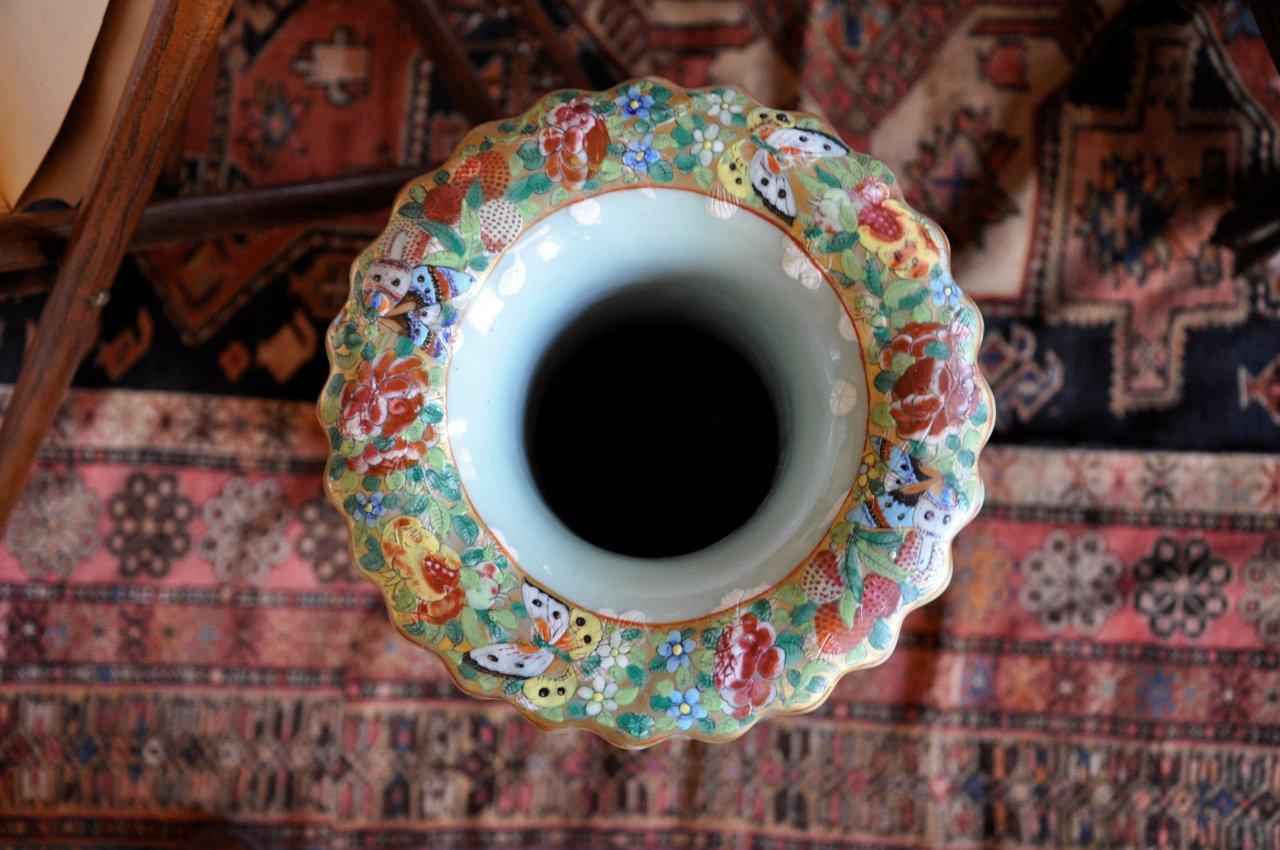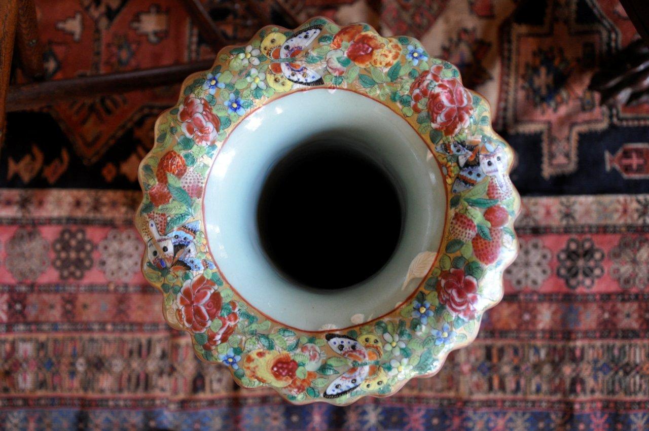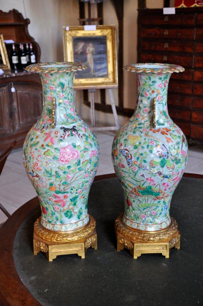 PAIRE de VASES balustre en porcelaine. Décor polychrome et or en plein et en léger relief sur fond vert d'eau d'oiseaux, papillons, chauves-souris, fleurs, fruits et feuillages. Frises de fleurs blanches sur le pied. Anses plates en forme de dragon bleu nuit et or et col évasé polylobé.