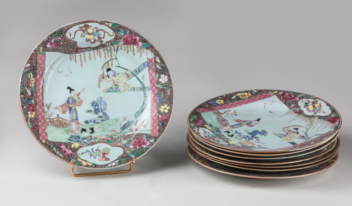Huit ASSIETTES en porcelaine de la famille rose, à décors de scènes galantes dans un jardin. L'aile richement décorée de treilles, de motifs floraux, pivoines et cartouches.