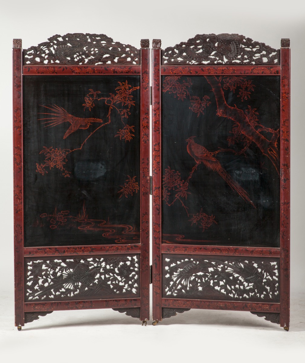 PARAVENT à deux feuilles en bois laqué noir et rouge. Décor "rapaces et dragons" en incrustation d'ivoire, os, nacre et bois sculpté. Au revers, décor en rouge d'oiseaux dans des branchages.