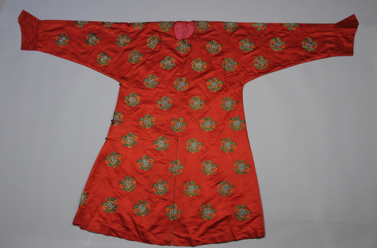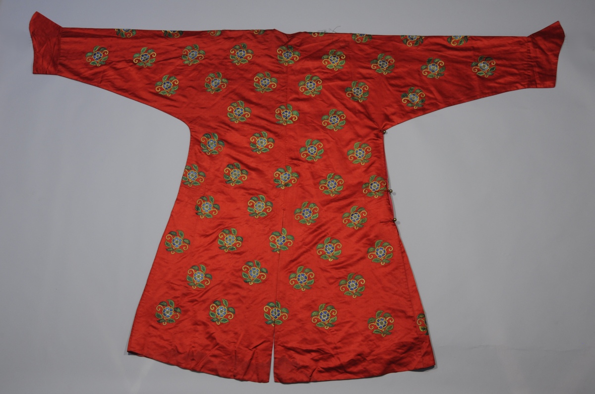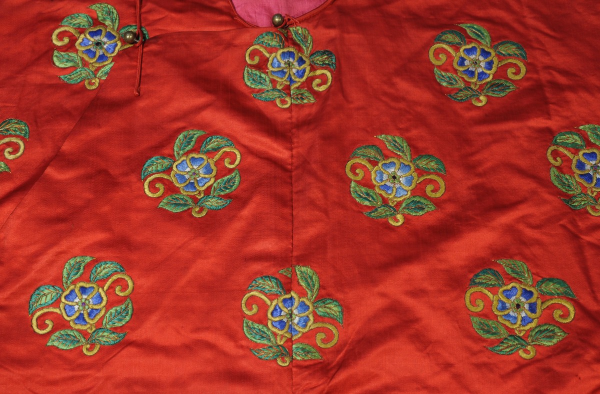 ROBE d'HOMME en soie rouge à décor brodé de pruniers...