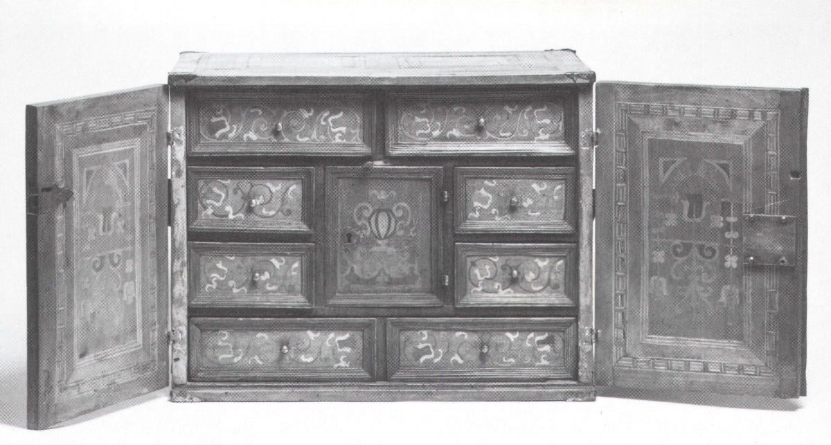 CABINET DE VOYAGE en bois naturel et incrustations, ouvrant à 2 vantaux fermant à clef ― dissimulant 8 tiroirs et 1 porte centrale. Décor de tulipes et figures géométriques. Anses latérales et cornières en métal. Flandres, XVIIe. Haut. 36, Long. 46, Prof 29 cm.
