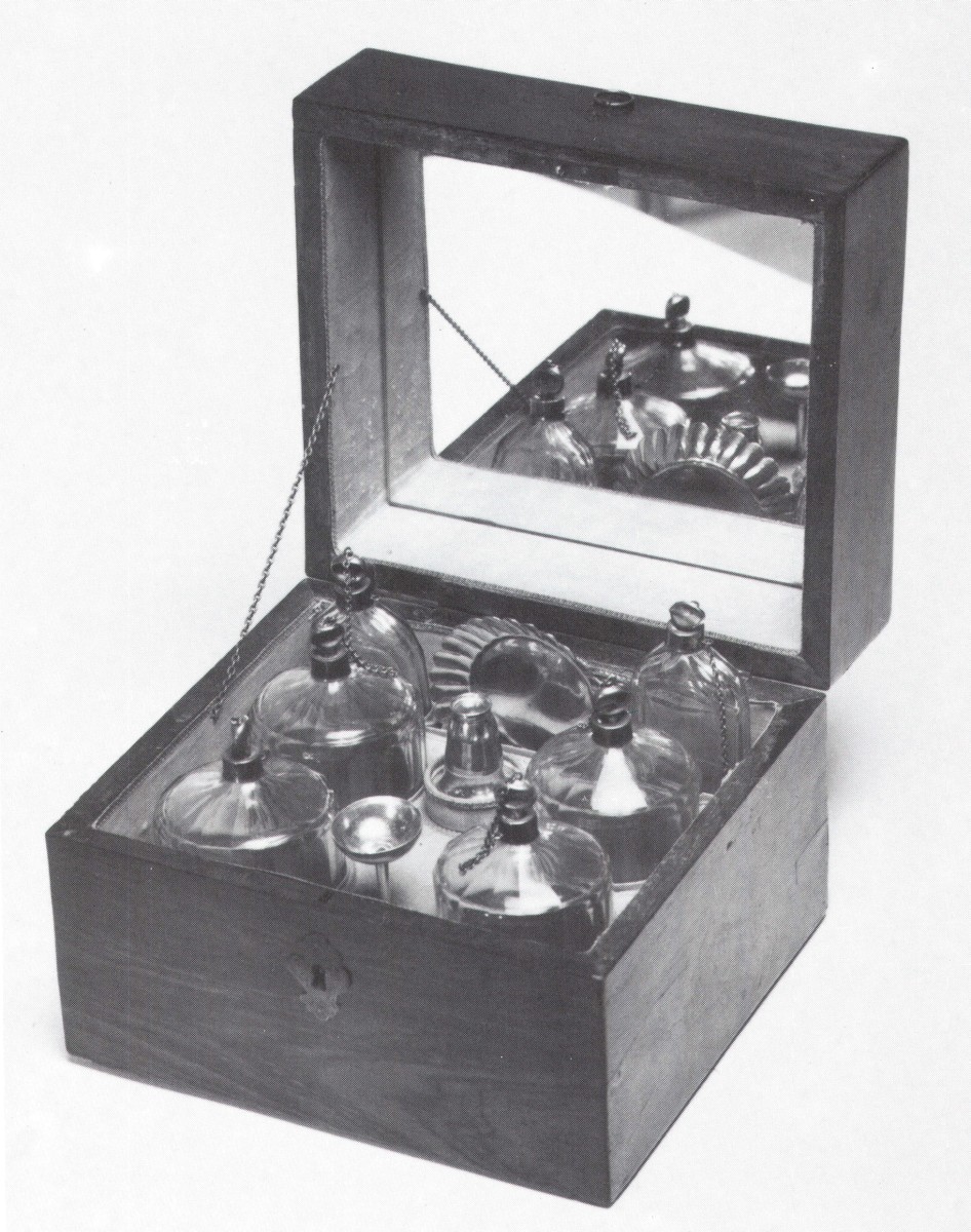 NÉCESSAIRE DE TOILETTE: dans un coffret en marqueterie et bois de placage à décor géométrique, fermant à clef: 2 flacons de senteur, 4 flacons de parfum, 1 entonnoir, 1 gobelet-godet, 1 coupelle en argent uni, le bord polylobé en doucine à côtes pincées. Verrerie soufflée à la bouche, travaillée à la pince. Argent, poinçon de la coupelle: Paris, 1750-1756. Poids 43 g. Louis XV (rest.). Haut. 17, Long. 23, Prof 21 cm.