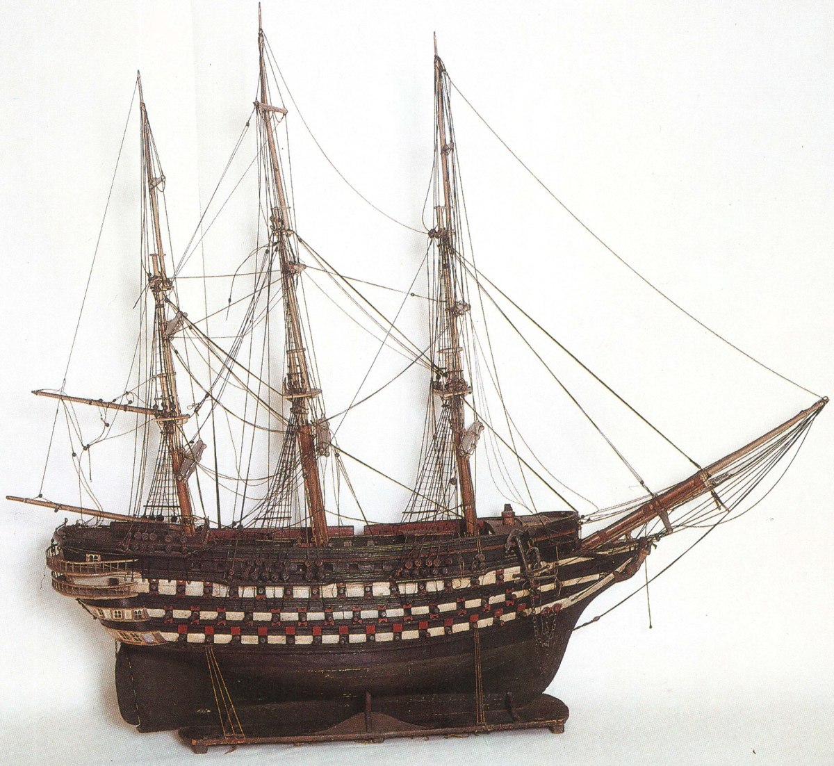 BRETAGNE. Modèle d'instruction destiné aux officiers et marins vers 1808; probablement construit dans les chantiers de l'arsenal de Brest. Vaisseau de guerre trois mâts, armé de 90 canons, trois ponts, construit en coque bordée. Long. totale 240, Long. de coque 185, Haut. totale 220, Haut. de coque 61, Larg. du pont 40 cm.