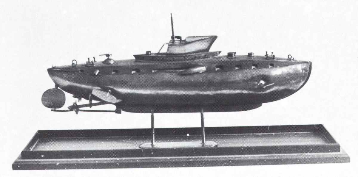 SOUS-MARIN. Pièce unique en cuivre construite par un sous-marinier à l'époque. Il s'agit vraisemblablement du type « PLUVIOSE », début du xxe siècle, un des premiers sous-marins construits en France. Le moteur est électrique en plongée et diesel en surface; il possède un gouvernail de plongée et deux hélices.