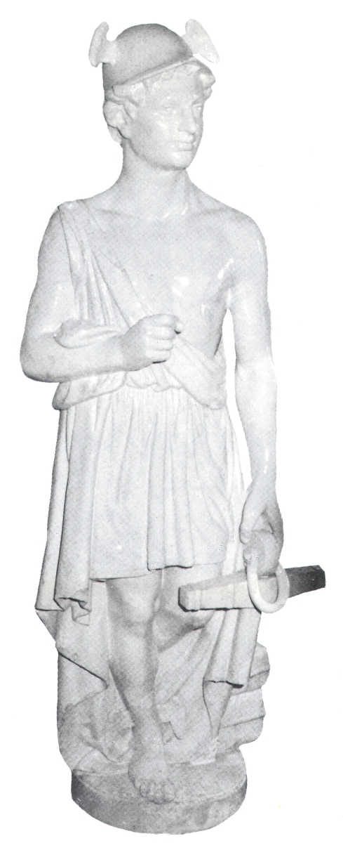 MERCURE et CYBÈLE. Statues terre cuite vernissée, blanche et nervures bleues. Nevers (?). XVIIe.-.XVIIIe. Haut. 130 cm (accid., rest.).