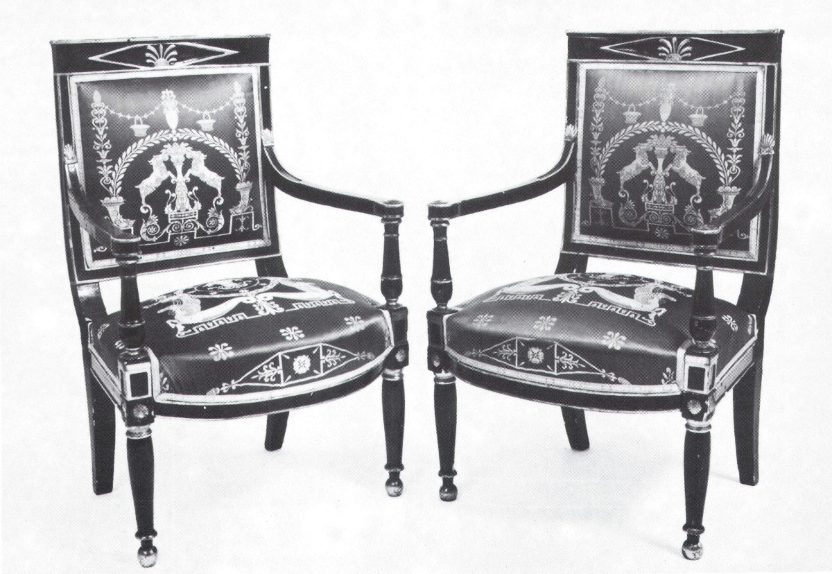 PAIRE DE FAUTEUILS en bois laqué noir, et rehauts or à décor de palmette losangée et rosaces. Piétement et accotoir à balustre. Dossier à la Reine. Directoire, circa 1795. Recouvert de lampas vert. Empire.