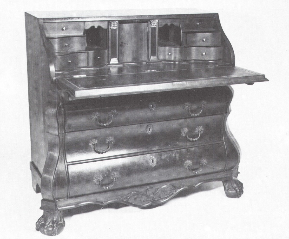 COMMODE-SECRÉTAIRE en pente à 4 niveaux de tiroirs, en acajou de Cuba mouluré et sculpté d'un nœud dans la partie inférieure. Piétement patins à griffes de lion. Travail de port, vraisemblablement de Bordeaux. Louis XV, milieu XVIIIe. Haut. 113, Long. 112, Prof 62 cm.