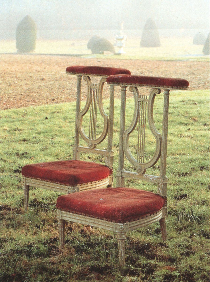 PAIRE DE CHAISES, appelées VOYEUSES A GENOUX, en bois mouluré, laqué -à dossier en lyre. Piétement à cannelures rudentées à pointes d'asperge, à rosace arrondie. Marque de propriété: Pour le salon de la marquise de Socofeuille. Estampille: H. JACOB. Louis XVI, circa 1788.