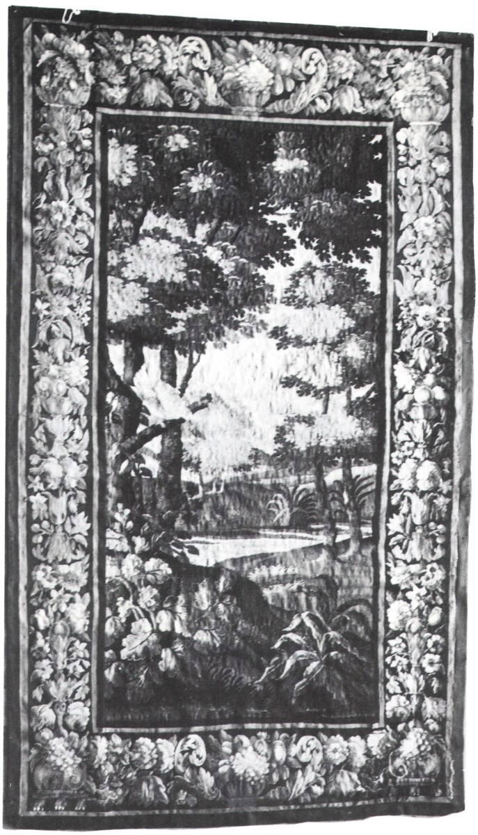 Tapisserie d'AUBUSSON, XVIIIe. Verdure au volatile près d'un plan d'eau, avec construction dans le lointain. Bordures reprises. Haut. 285,