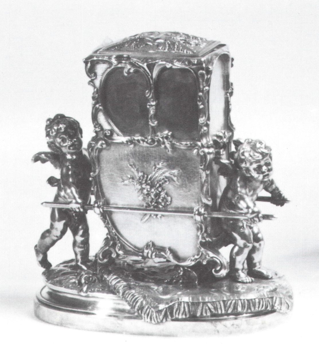 Rare COFFRET A CIGARES en bronze argenté, représentant une chaise à porteurs aux deux amours. Couvercle sur la partie supérieure. Style Louis XV-Rocaille, Napoléon Ill. Haut. 22, Long. 21, Prof. 15 cm. Signé: AUG. MOREAU.