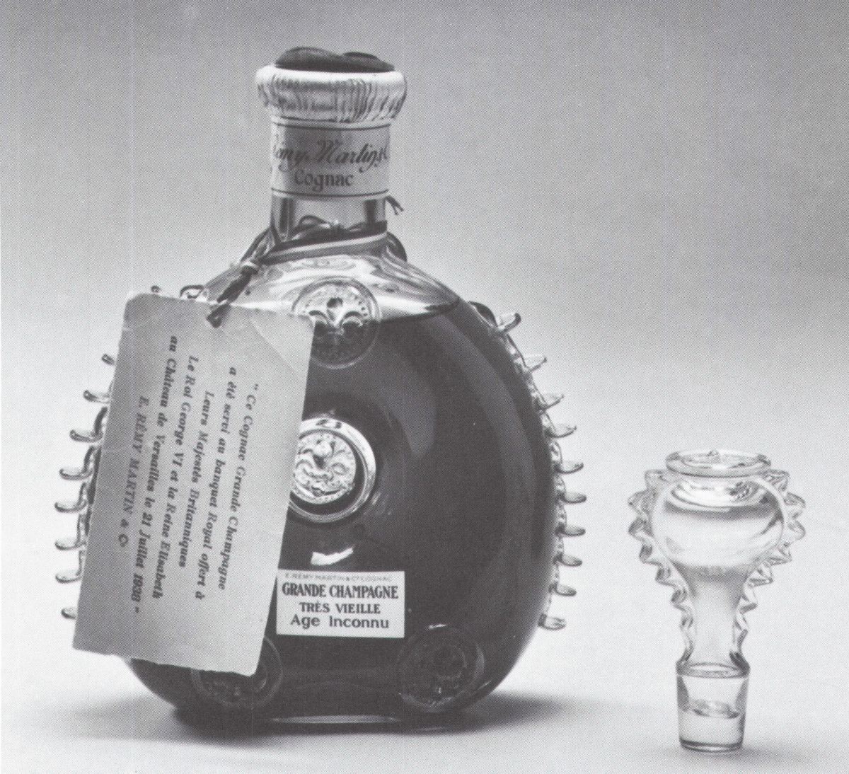 Flacon en cristal de BACCARAT à décor de fleurs de lys, contenant un cognac de Grande Champagne de chez E. RÉMY-MARTIN. Service du banquet royal offert à Leurs Majestés britanniques le roi George VI et la reine Elisabeth au château de Versailles le 21 juillet 1938. Etiquette et flot tricolore. Haut. 21 cm.