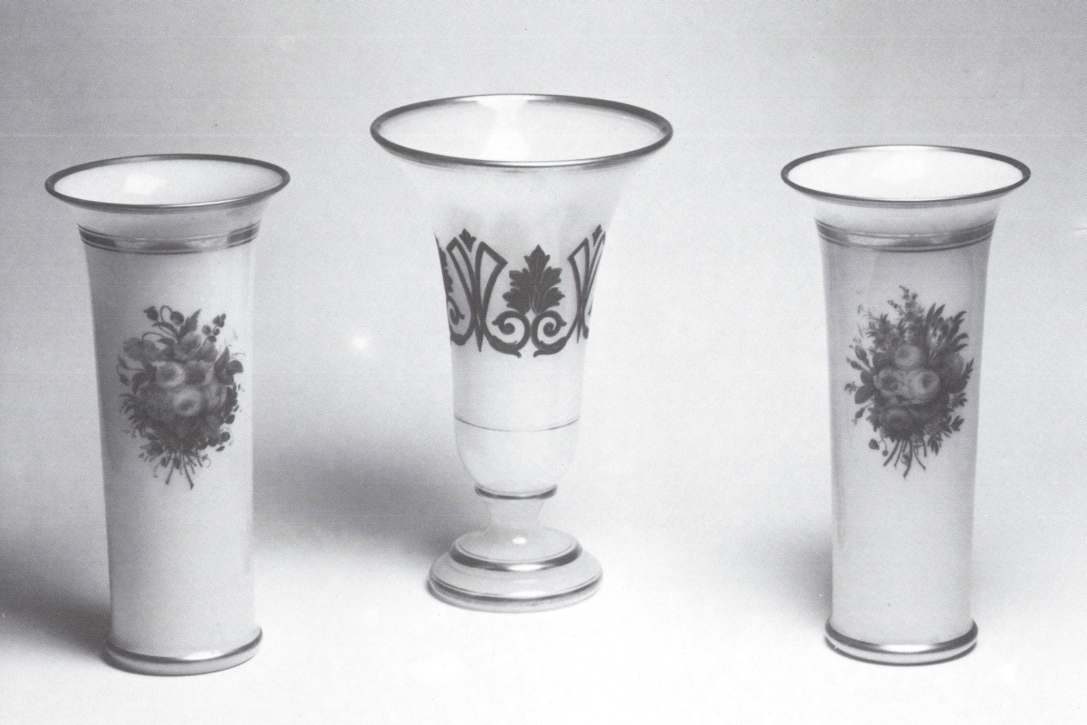 PAIRE D'OPALINES en forme de rouleau évasé, à décor floral polychrome et filets or. Romantique, milieu XIXe. Haut 30, Diam. 15 cm.