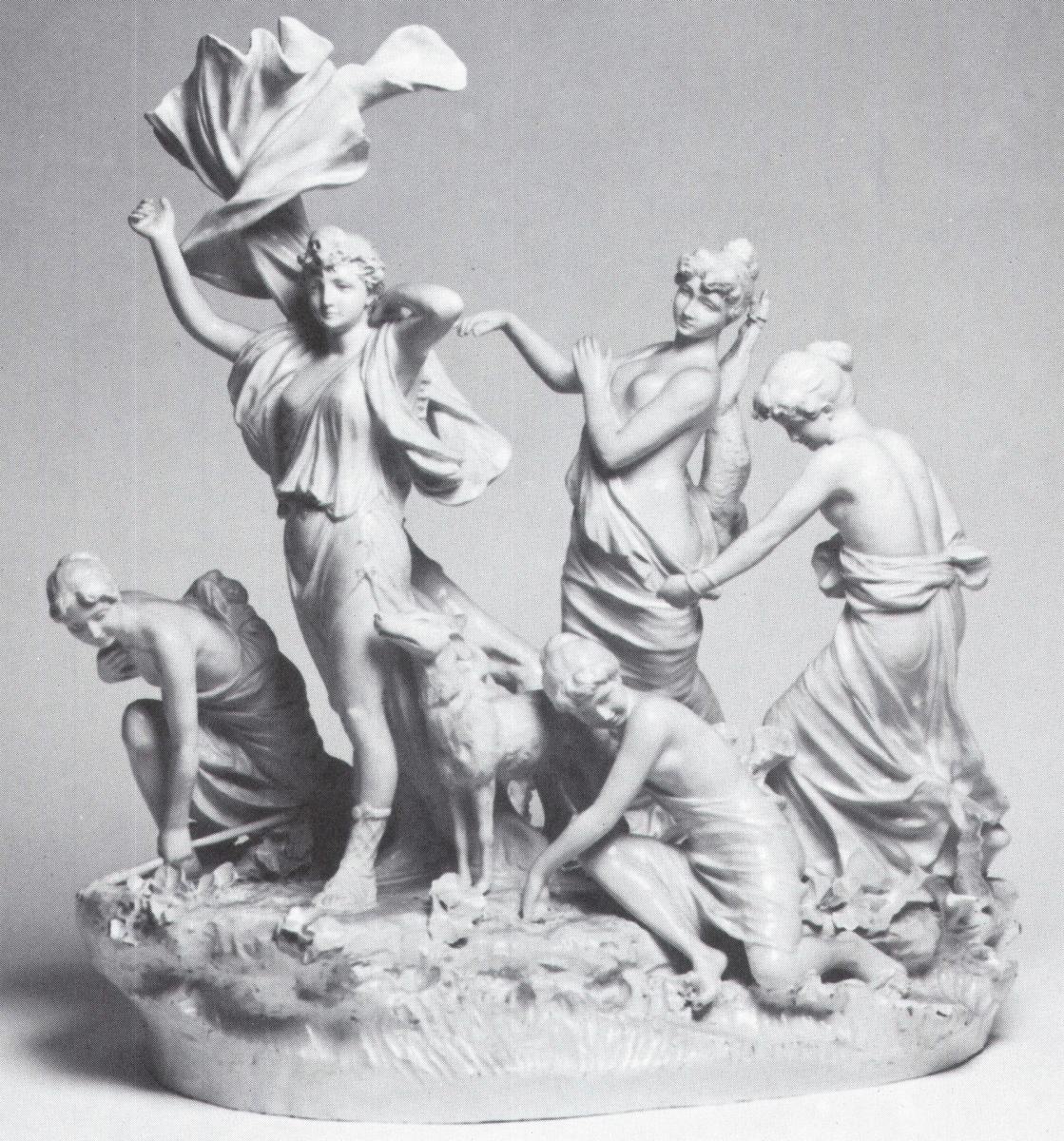GROUPE en céramique vernissée « Diane chasseresse entourée de ses nymphes ». Marque en creux: N, couronné. Naples (?). Début XXe. Haut. 60, Long. 46, Prof 33 cm.