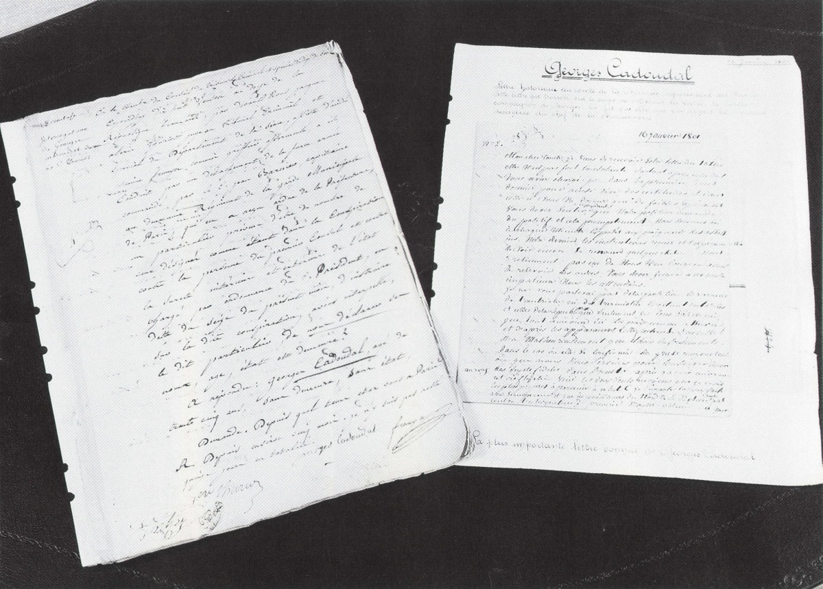 Document d'un très grand intérêt historique: il s'agit d'un des interrogatoires de Georges Cadoudal après son arrestation, accusé "de conspiration contre la personne du premier consul et contre la sureté intérieure et extérieure de l'état". Il reconnait être venu à Paris dans l'intention d'attaquer le premier consul et de le remplacer par un Bourbon par la force. Son souci est de ne compromettre aucun de ses complices.