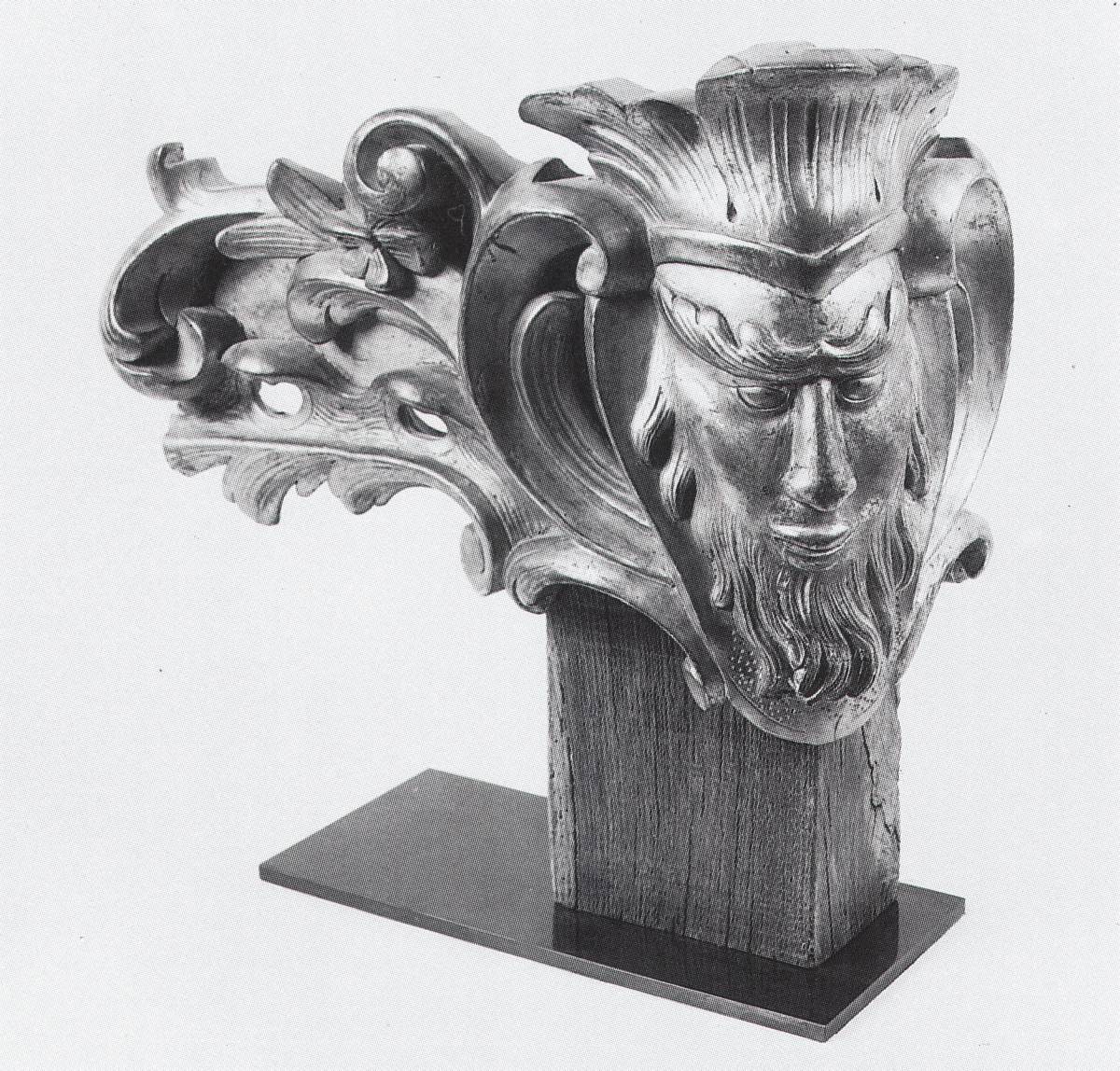 MOTIF DE PROUE en bois sculpté et doré à décor de visage d'homme barbu, dans des entrelacs d'acanthes et de fleurs. (monture et soclage postérieurs). Époque de la Régence, XVIIIème.
