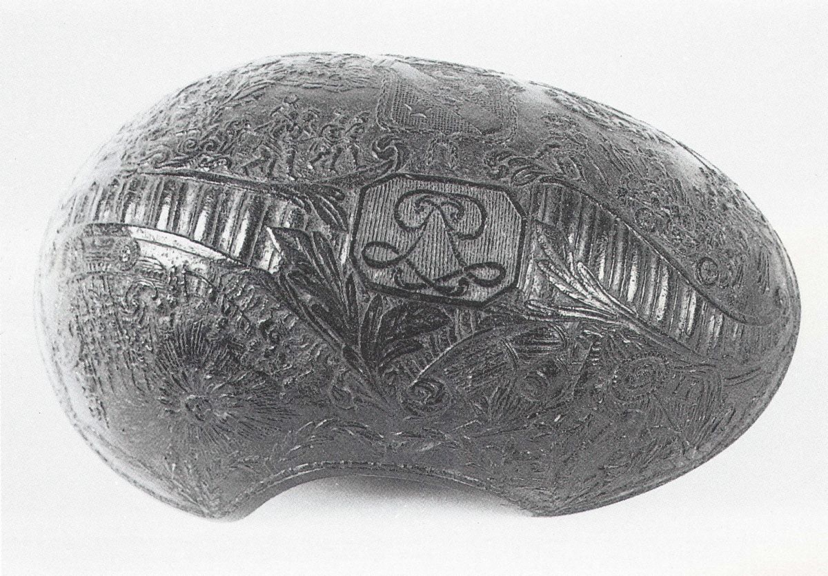 PLAT A BARBE travaillé dans une importante noix de coco, habituellement dénommée, du fait de la taille de cette variété, coco-fesse. Ce type d'ouvrage "des isles" comme on disait au XVIIIème siècle peut être attribué à trois catégories d'artistes, qui ont pour point commun l'aventure maritime: travail de bagnard ou de prisonnier; travail de "bateau" pour occuper les longues heures de traversée; travail de port: avant d'être autorisés à travailler l'ivoire, les compagnons étaient invités à se "faire la main" sur des matériaux aussi durs et moins coûteux. Dans la région malouine, c'est ainsi que furent exécutés certains travaux de Maîtrise. Le prestige du décor et la présence d'armoiries surmontées d'une couronne de marquis, l'extrême finesse de l'exécution permettent de penser qu'il s'agit d'un cadeau fait à un grand personnage dont il convenait de célébrer par l'abondance des références mythologiques martiales, le succès des armes. Armoiries de la famille de PONS de RENNEPONT, originaire de Champagne qui remonte sa filiation à Gillebin de Pontibus, anobli par le Roi Charles VI en 1422. Deux maréchaux de camp, Chevaliers de Malte ou de Saint Louis, l'un lieutenant général, tous deux titrés marquis sont à mentionner au XVIIIème. Rare et précieux travail d'époque Louis XV, objet de haute curiosité.